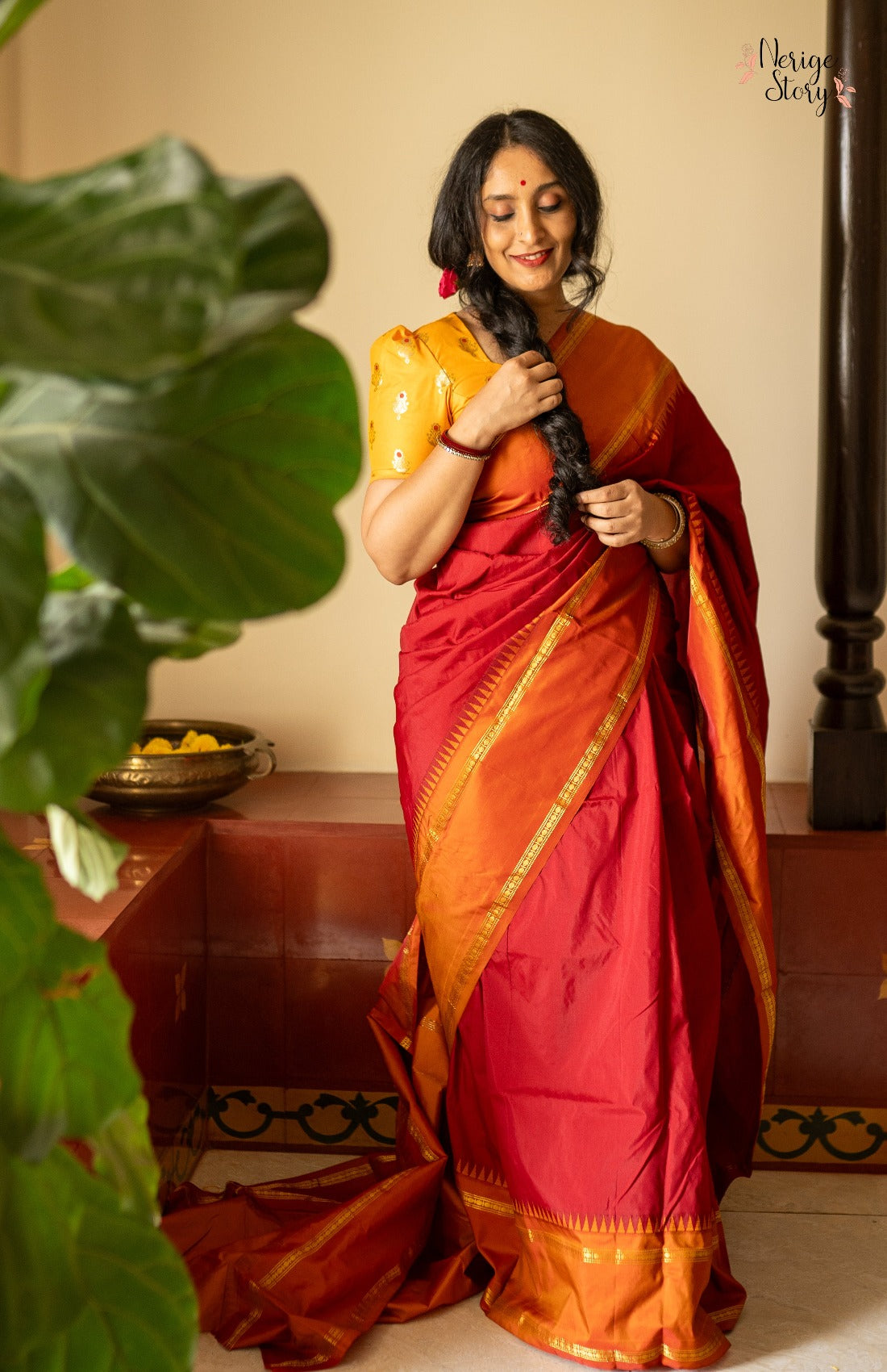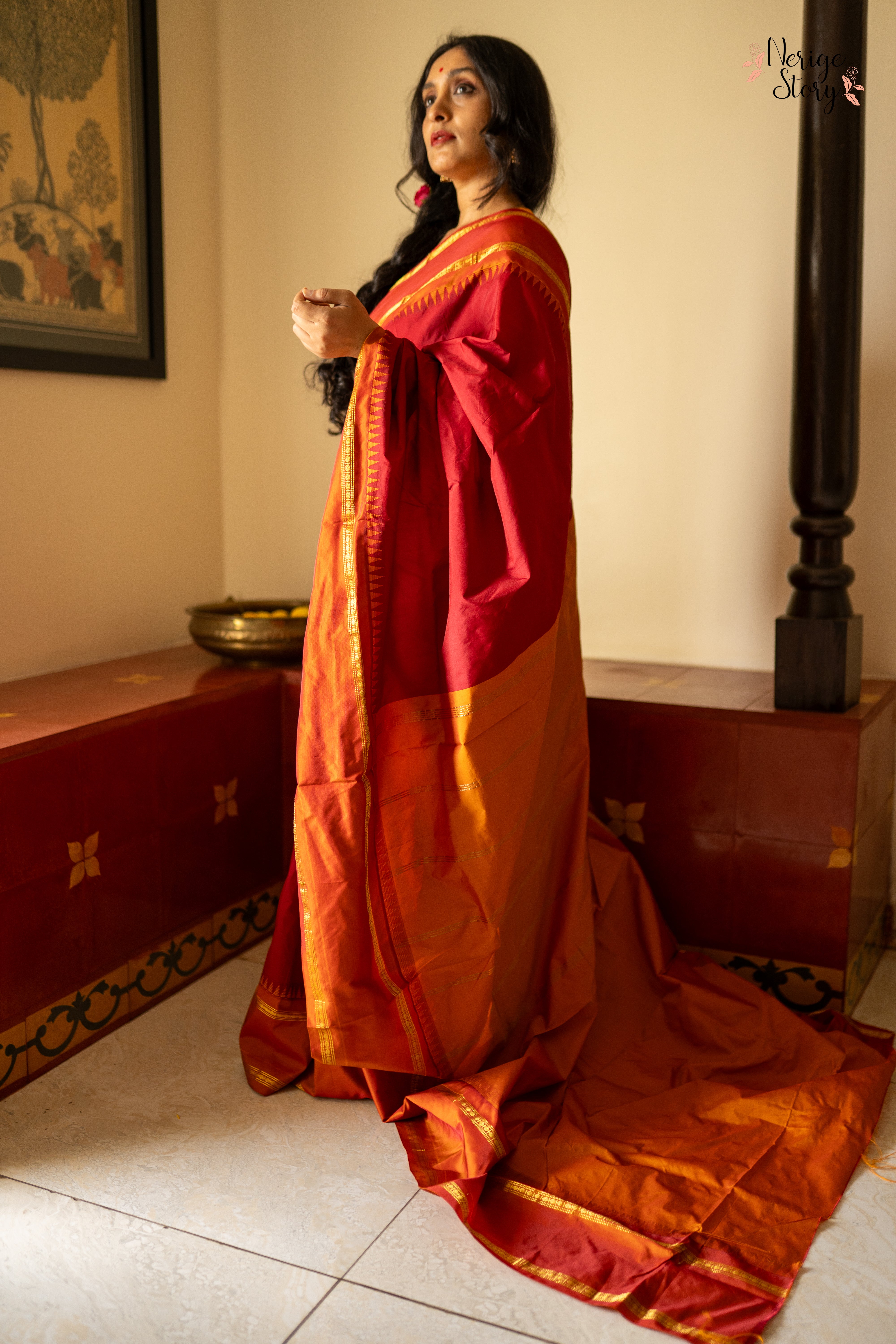 A stunning red semi Bangalore silk saree with an orange border and a gold zari border with rudraksham motifs. The saree has an orange pink pallu with zari lines on it.