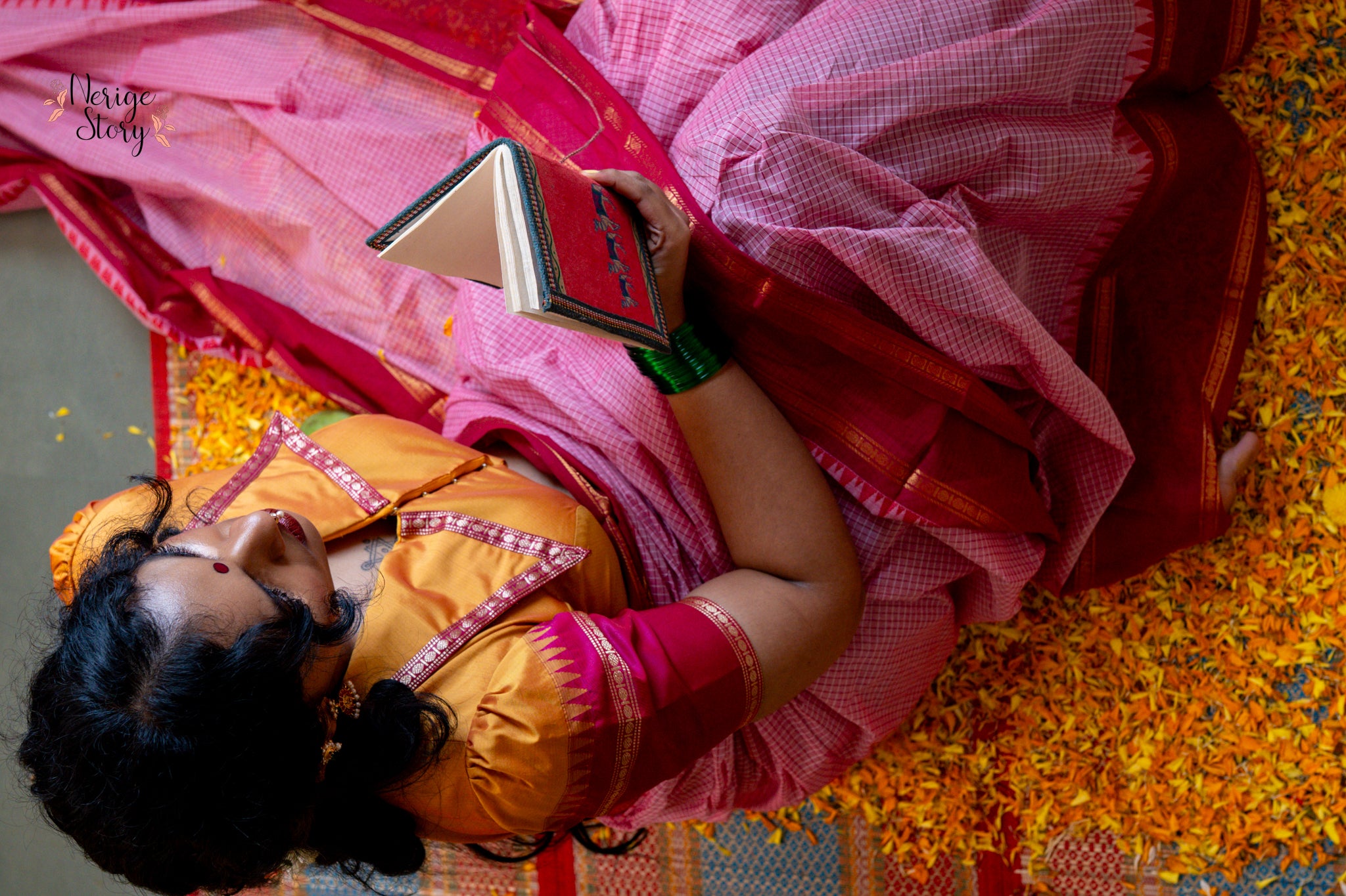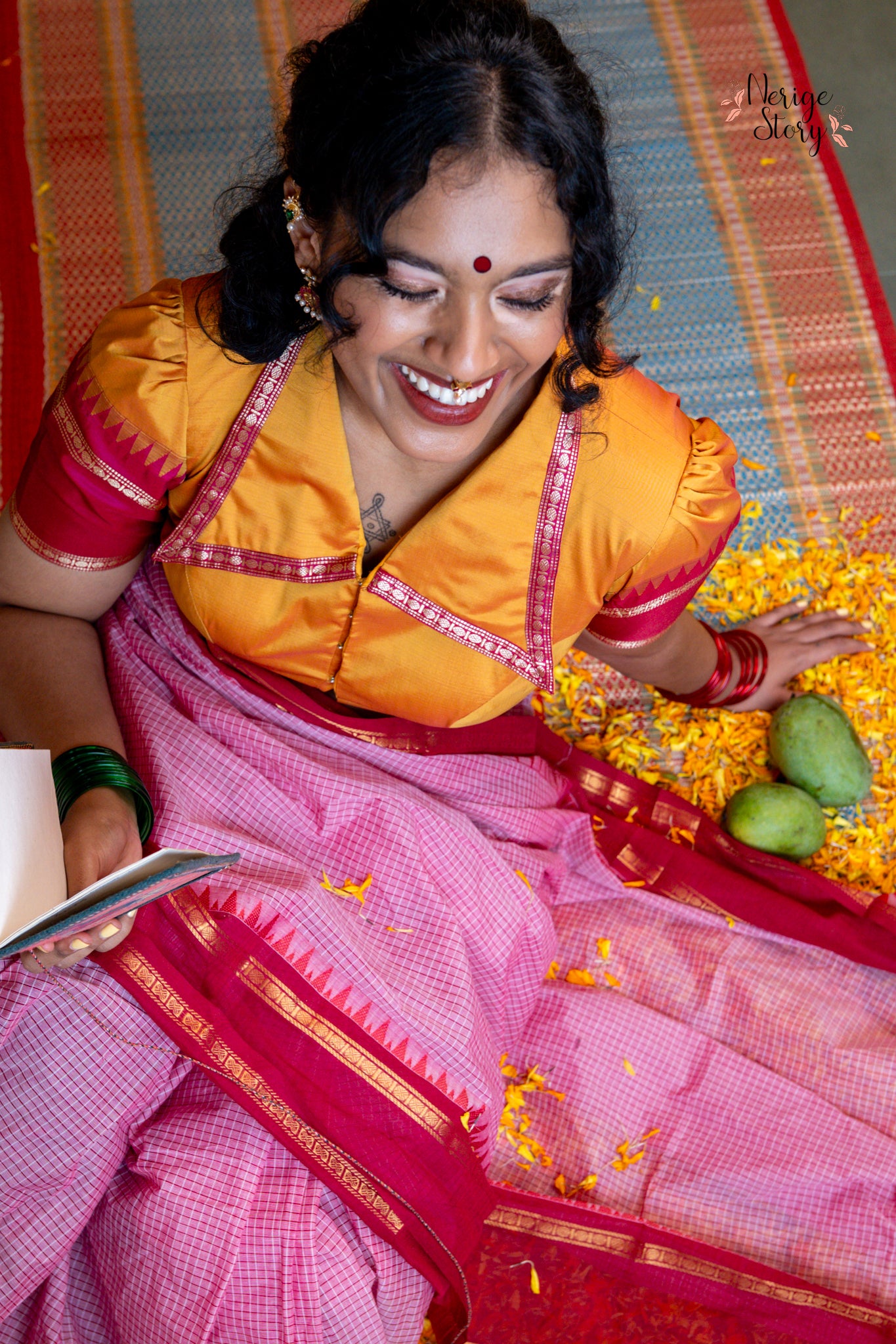 A striking vintage blouse in a timeless semi-bangalore silk yellow and pink combination, featuring a statement collar inspired by the 70s. The collar is delicately adorned with gold Rudraksham zari, while the elbow-length sleeves carry double pink zari borders. Finished with a closed back, this blouse is an ode to old-school elegance. The blouse has the closing hooks in the front.