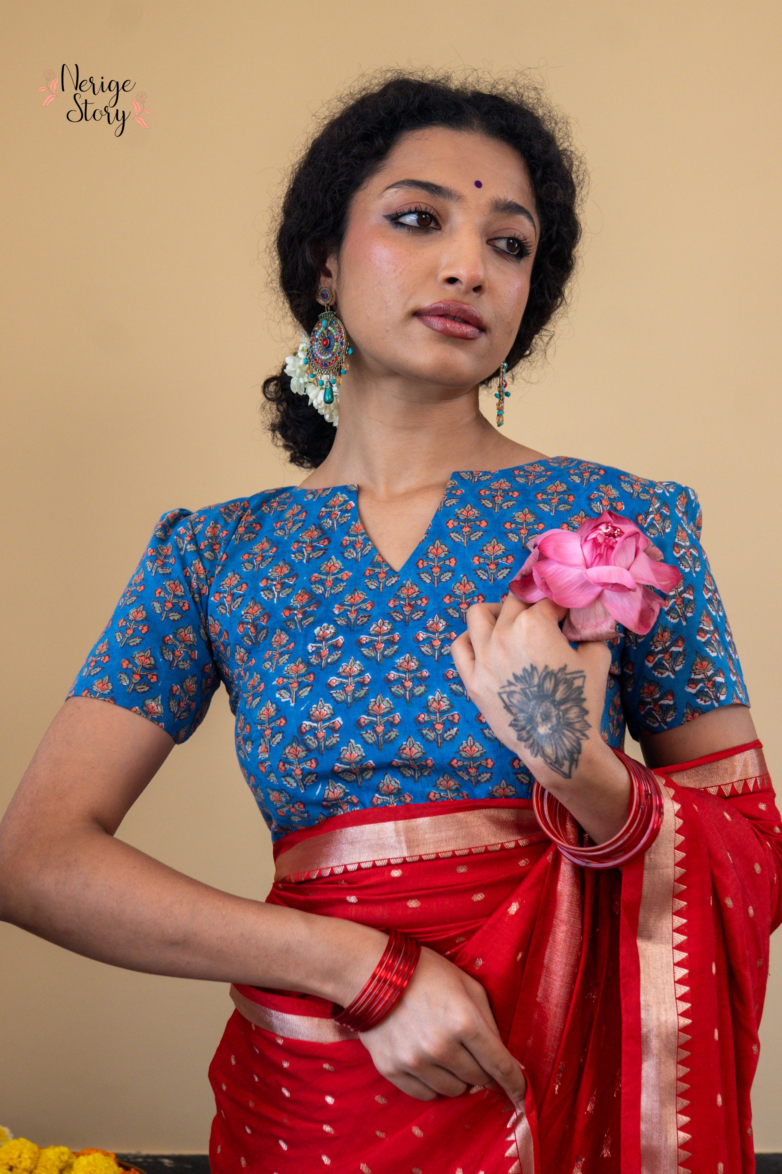 A lovely blue mul cotton blouse, handblock printed with care. It features a soft V-neck, a closed back with yellow potli buttons, and slight puff sleeves that lend it a subtle vintage charm.