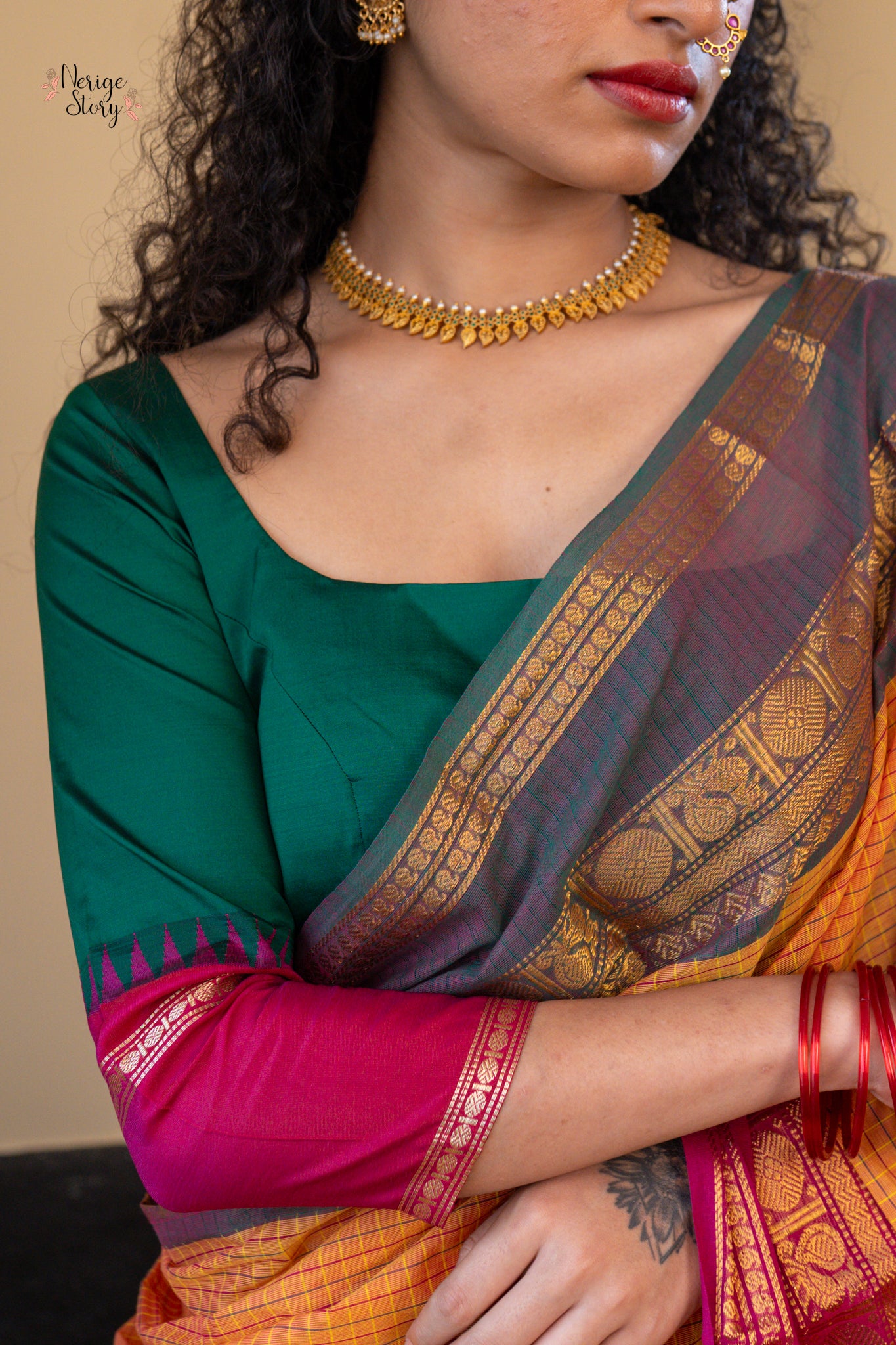 A stunning green and pink vintage semi-bangalore blouse, designed with soft 3/4th sleeves featuring rich Rudraksham zari borders in pink. The square back has a delicate tie-up detail for added comfort and elegance. The body of the blouse carries a gentle sheen, while contrast piping at the neckline adds a refined finish.