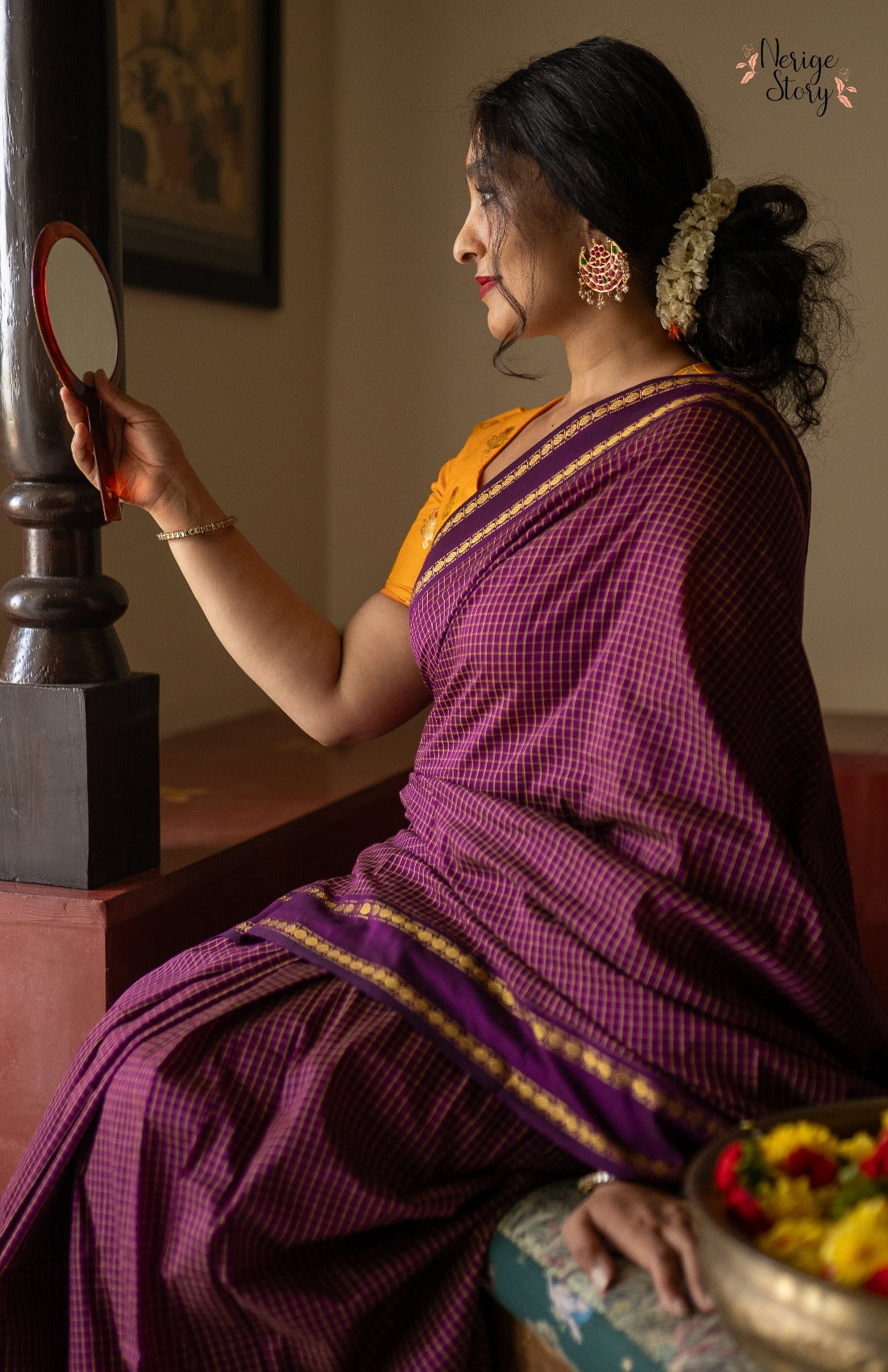 Pooja in a lovely purple chequered cotton base and double gold zari border with woven Rudraksham motifs, this stunning saree is certain to add a touch of sophistication and exclusivity to any ensemble.