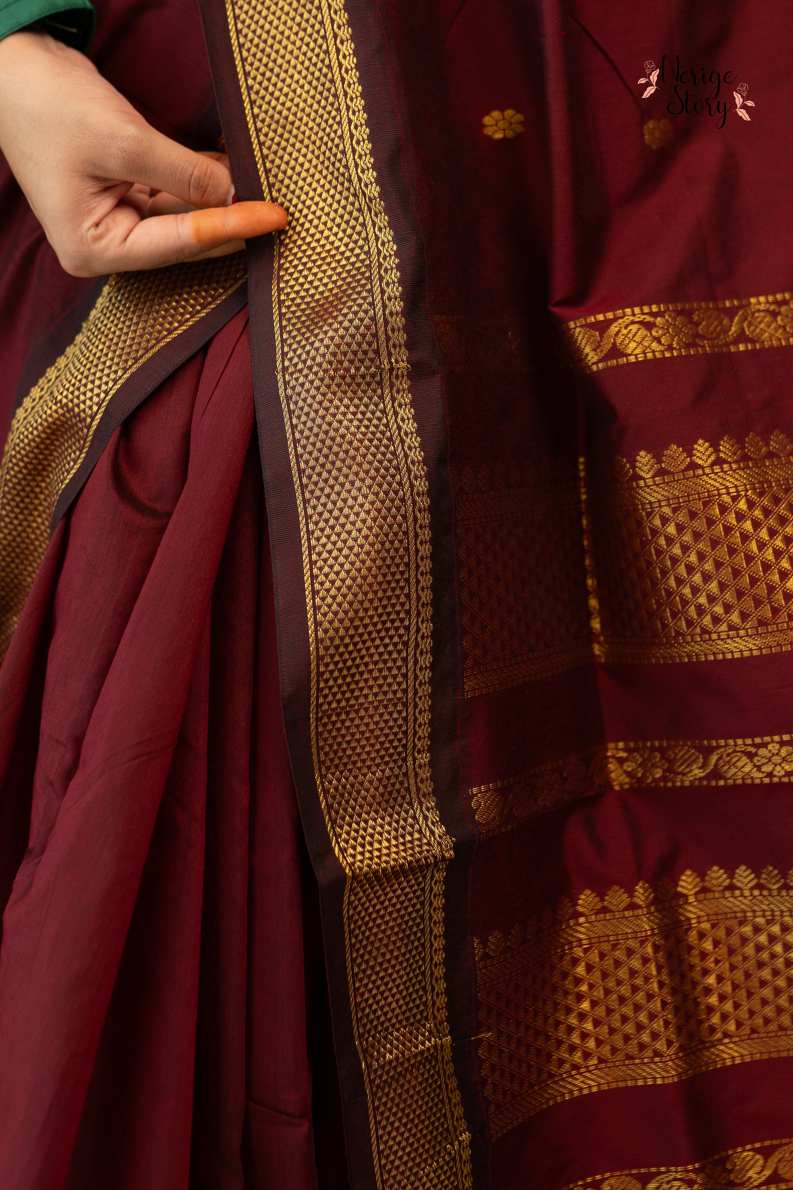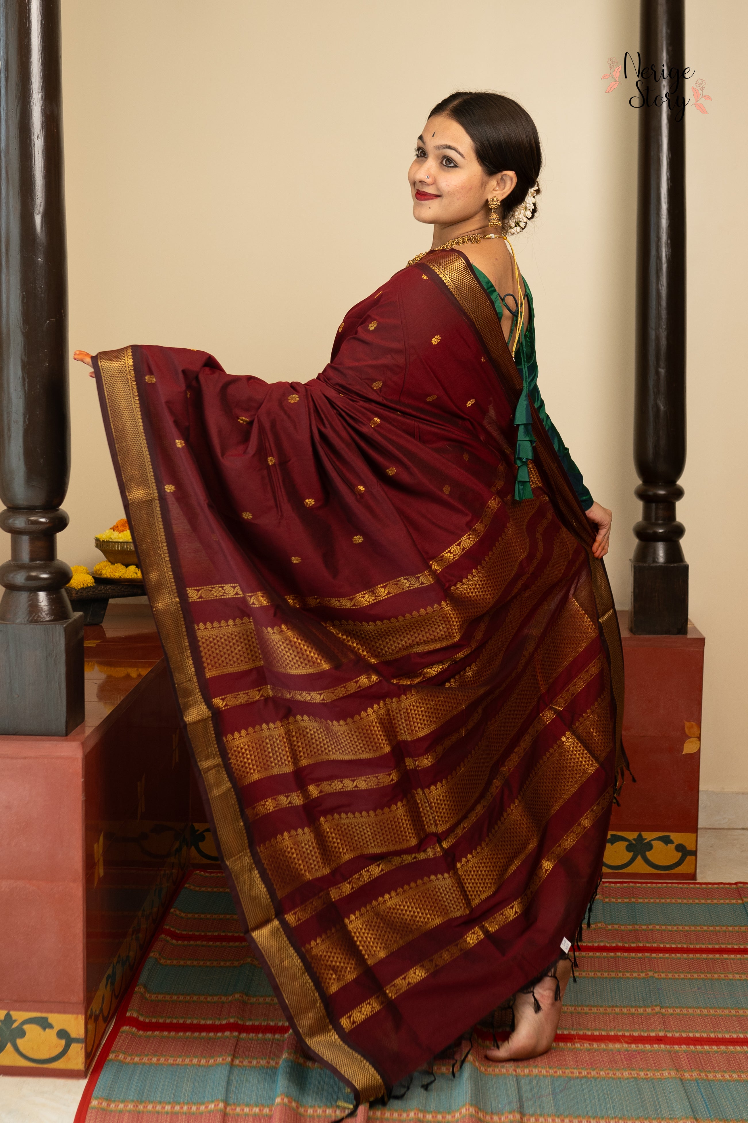Achieve timeless elegance with RAGAVARDHINI, a traditional cotton blend saree that boasts a luxurious combination of maroon and gold. Its intricate border adorned with gold zari and floral buttas give an exclusive look, perfect for a timeless occasion