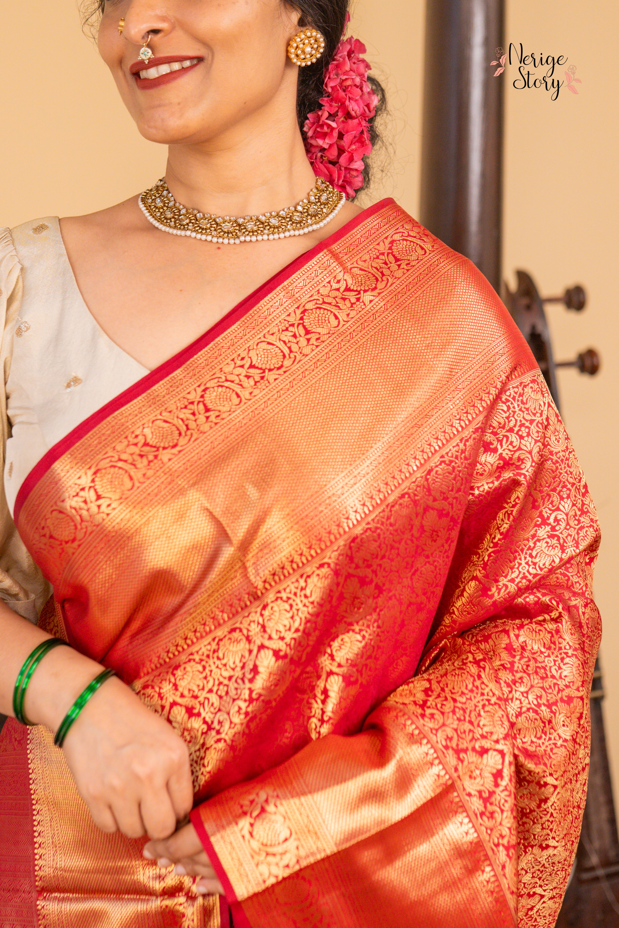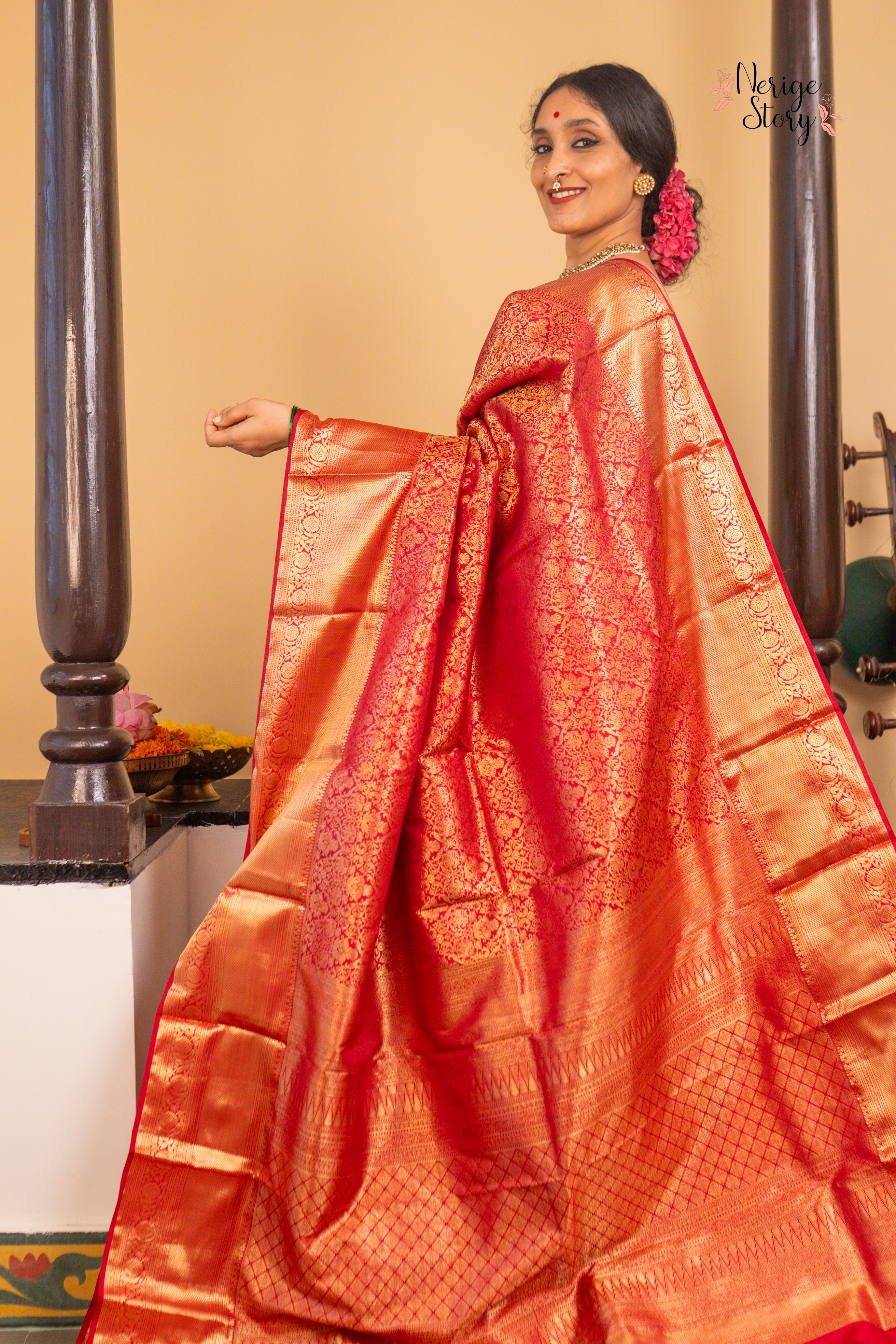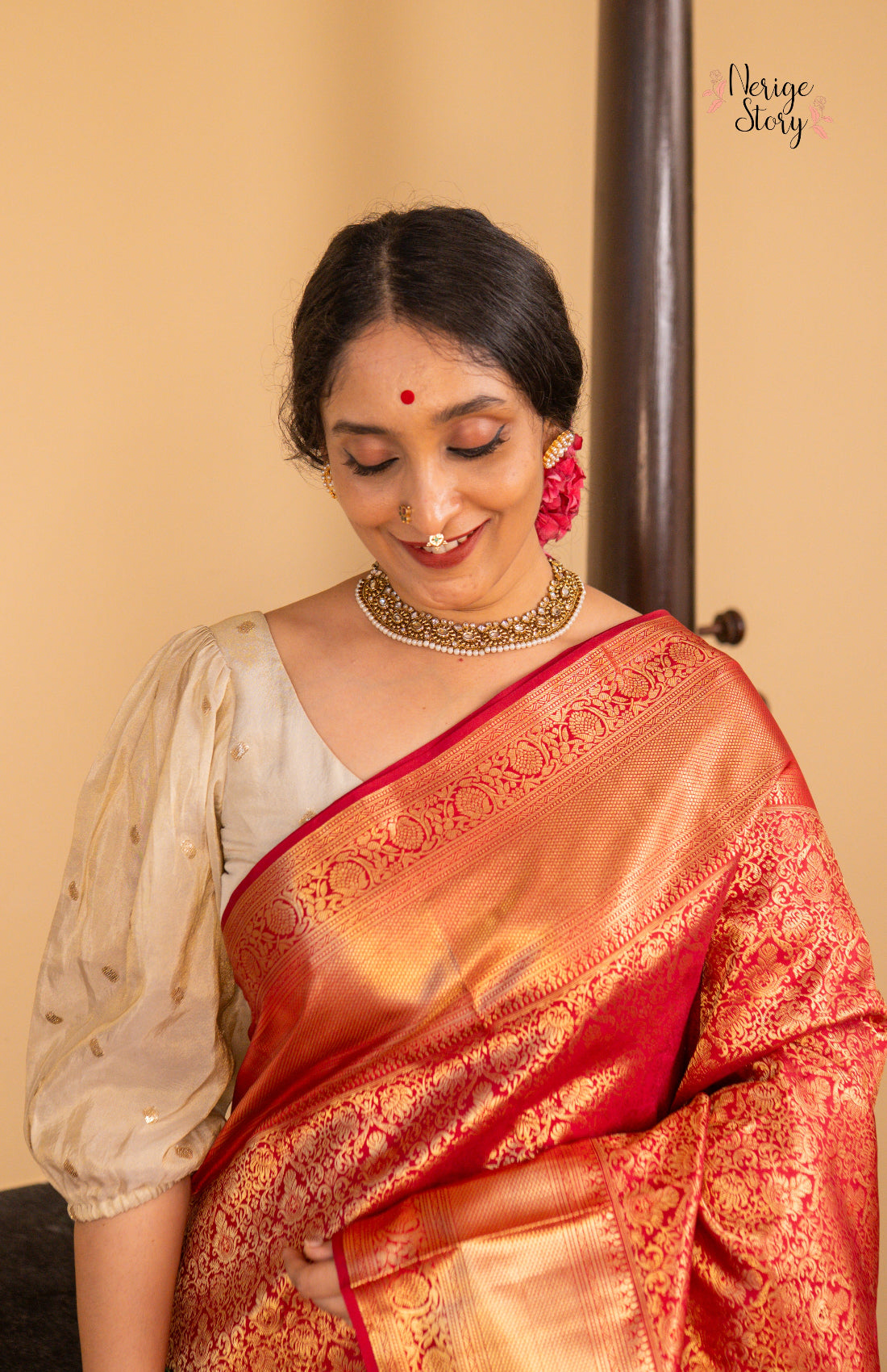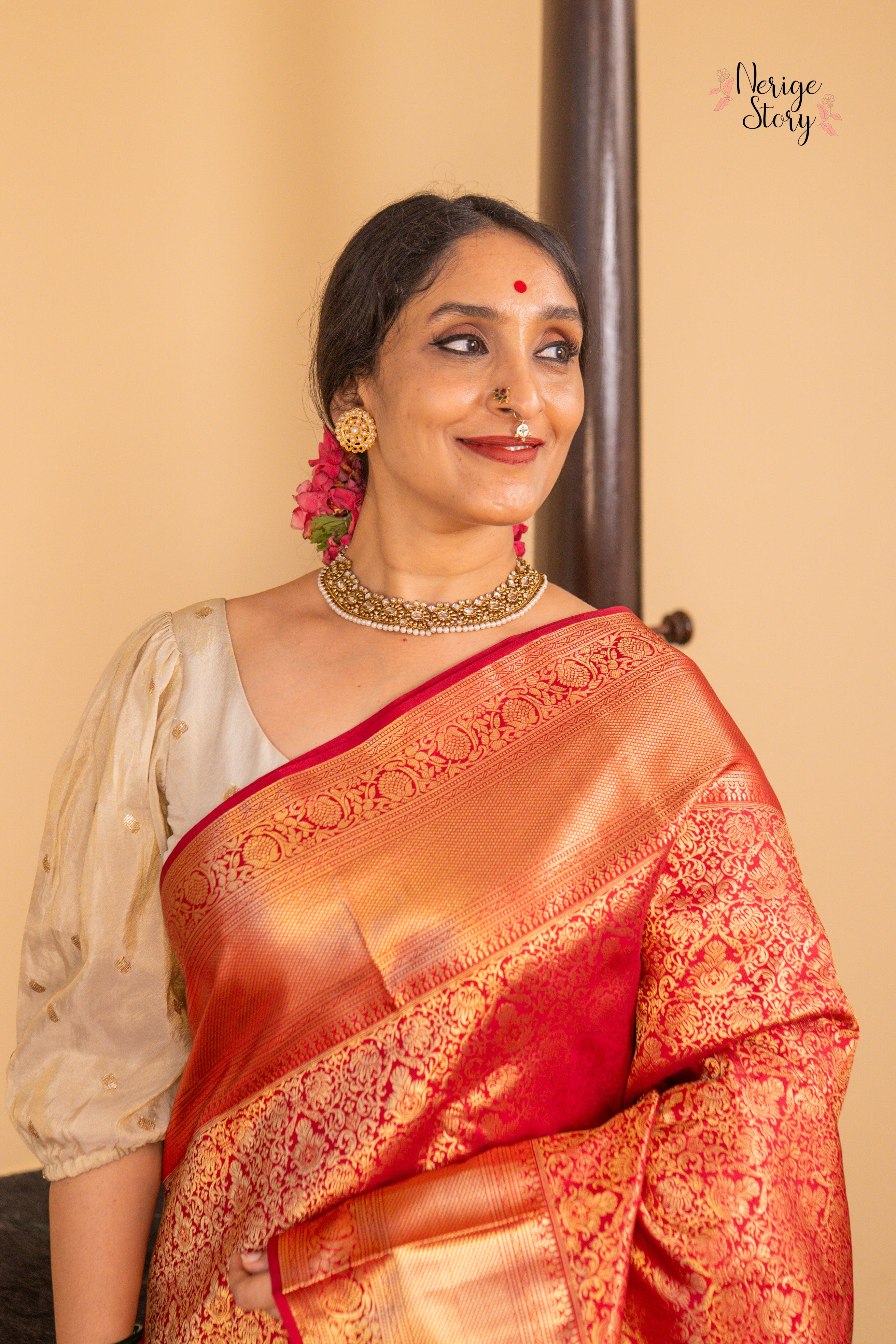 Pooja in a lovely red Kanjeevaram pure silk saree with gorgeous jacquard woven on the body of the saree and an intricate gold zari border. The pallu of the saree has stunning gold and red zari and a gorgeous red blouse.
