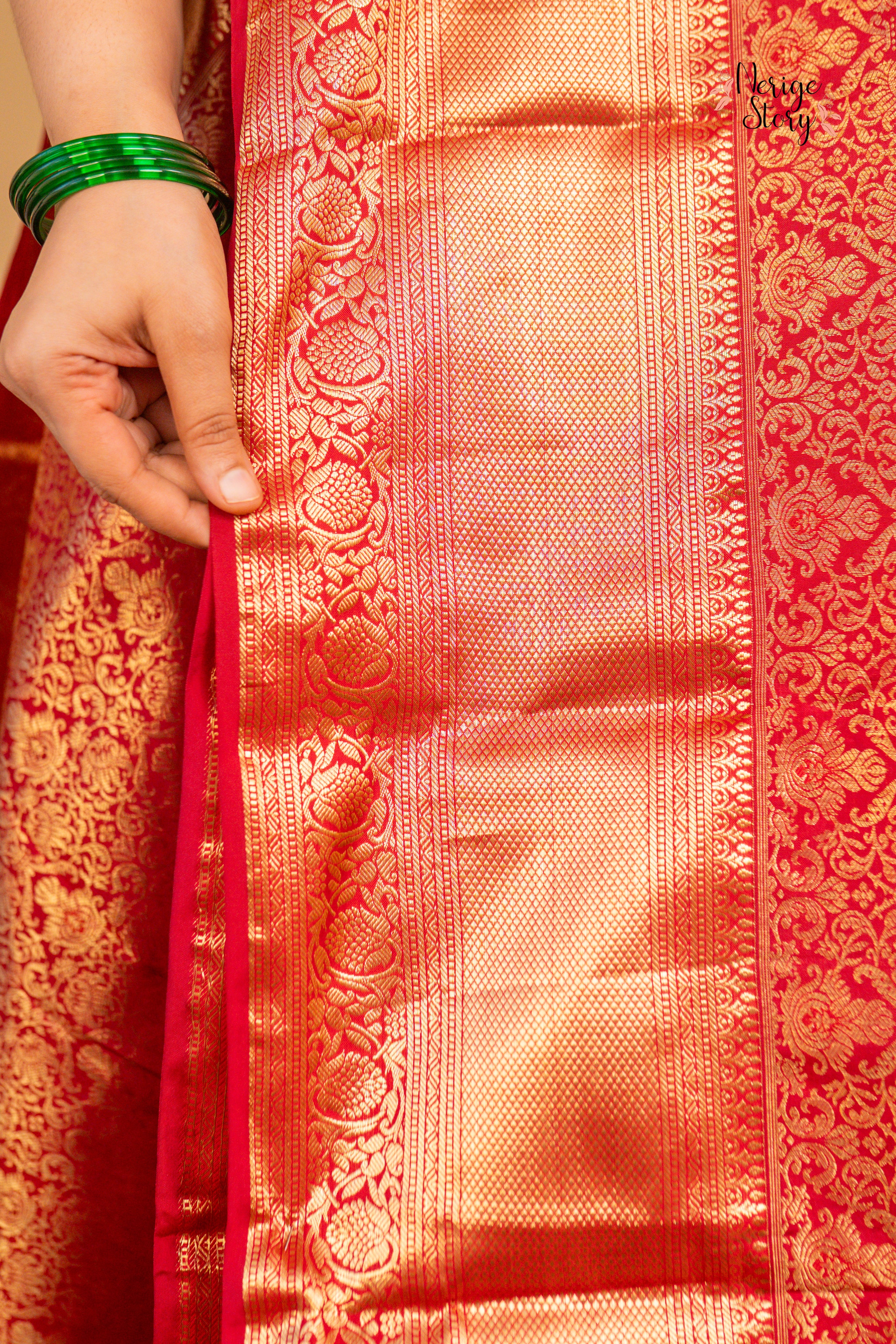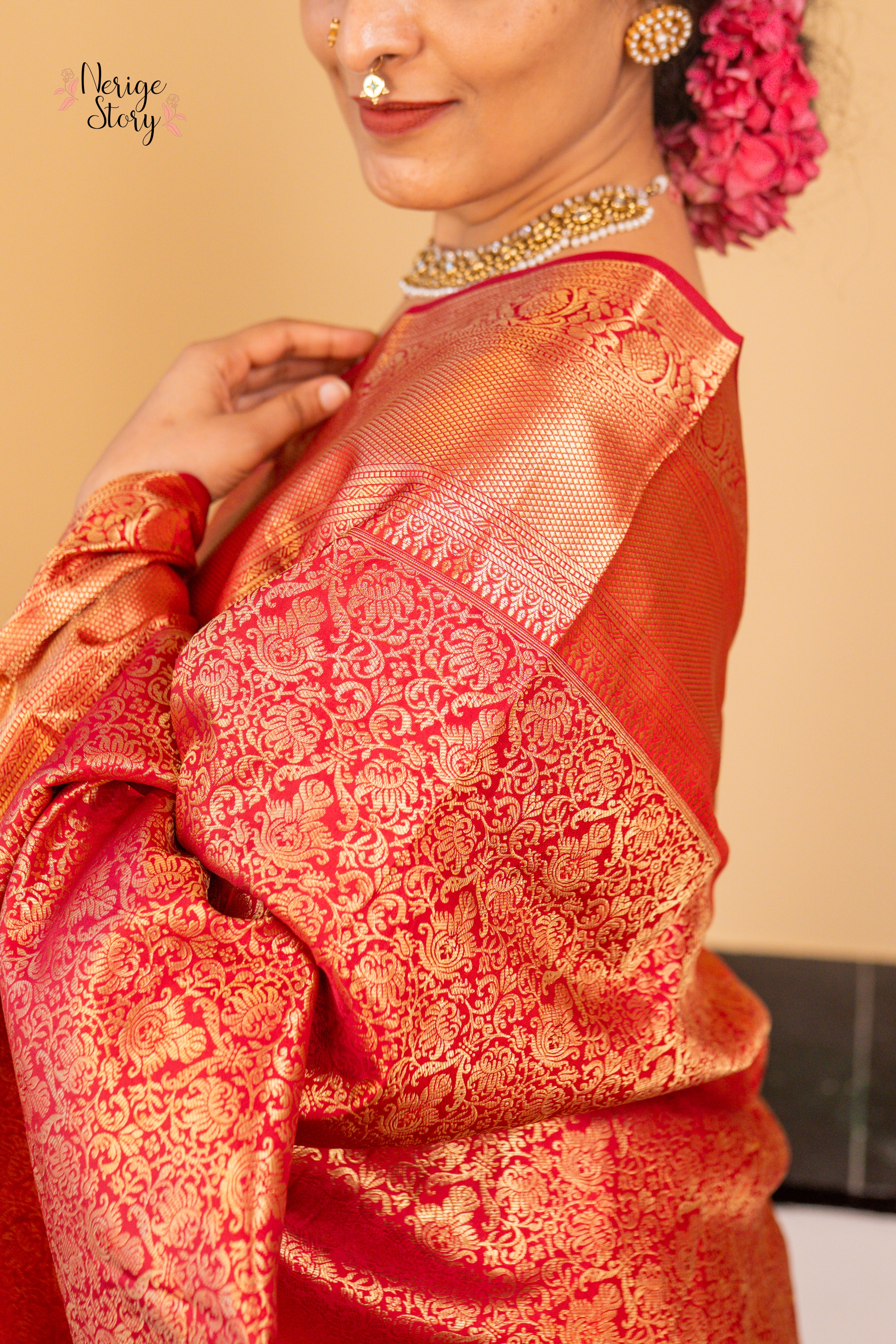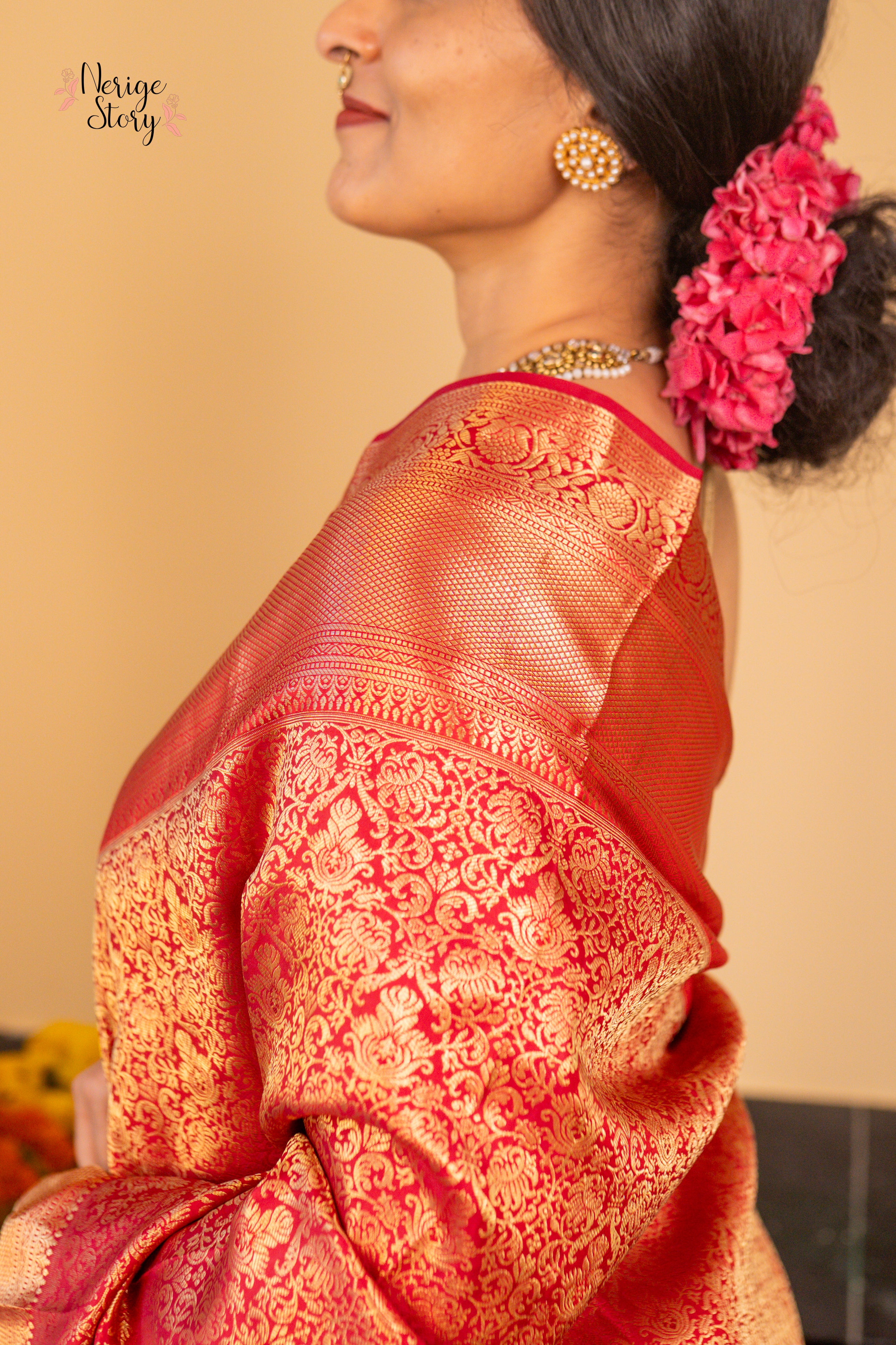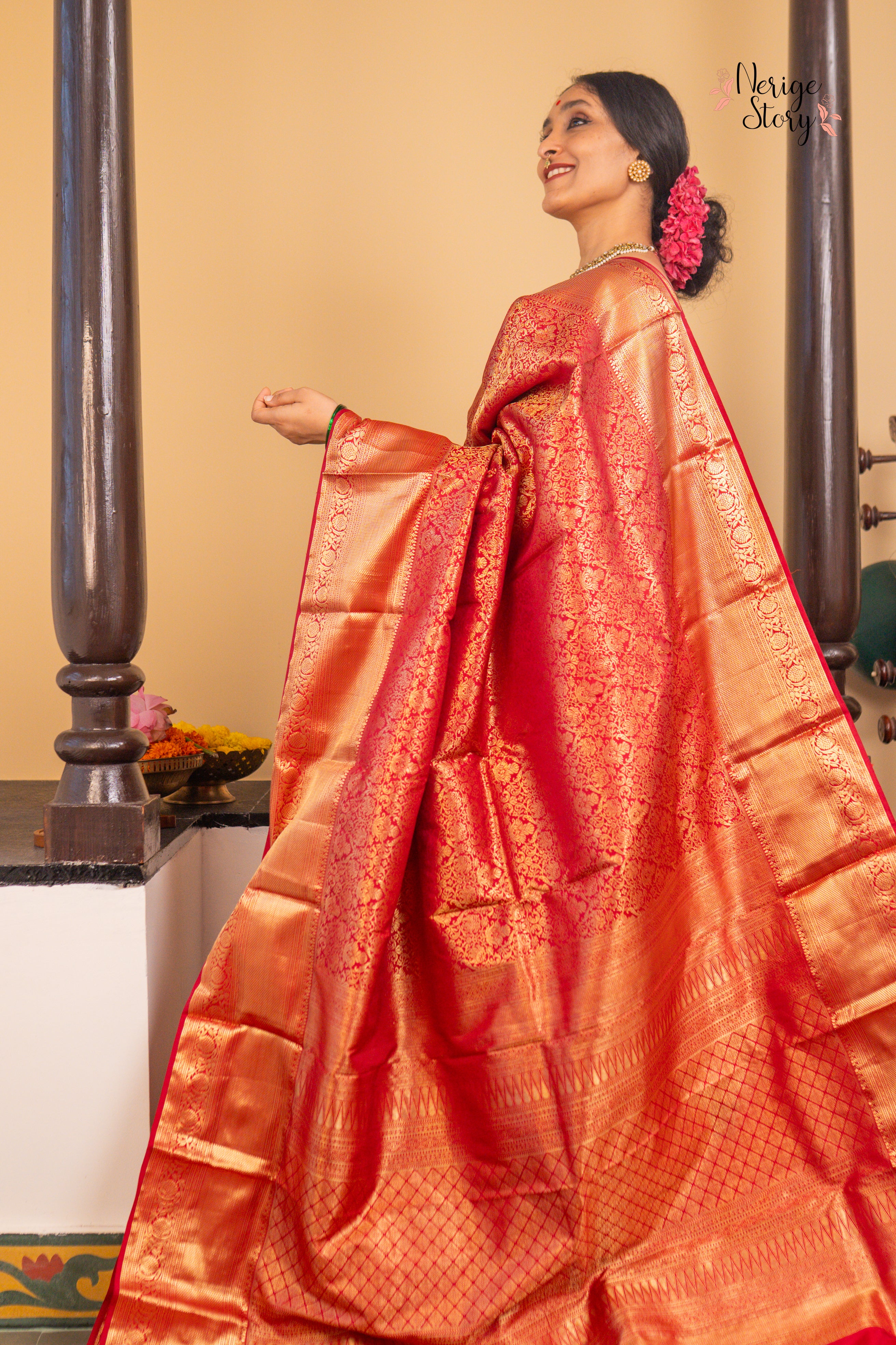 Pooja in a lovely red Kanjeevaram pure silk saree with gorgeous jacquard woven on the body of the saree and an intricate gold zari border. The pallu of the saree has stunning gold and red zari and a gorgeous red blouse.