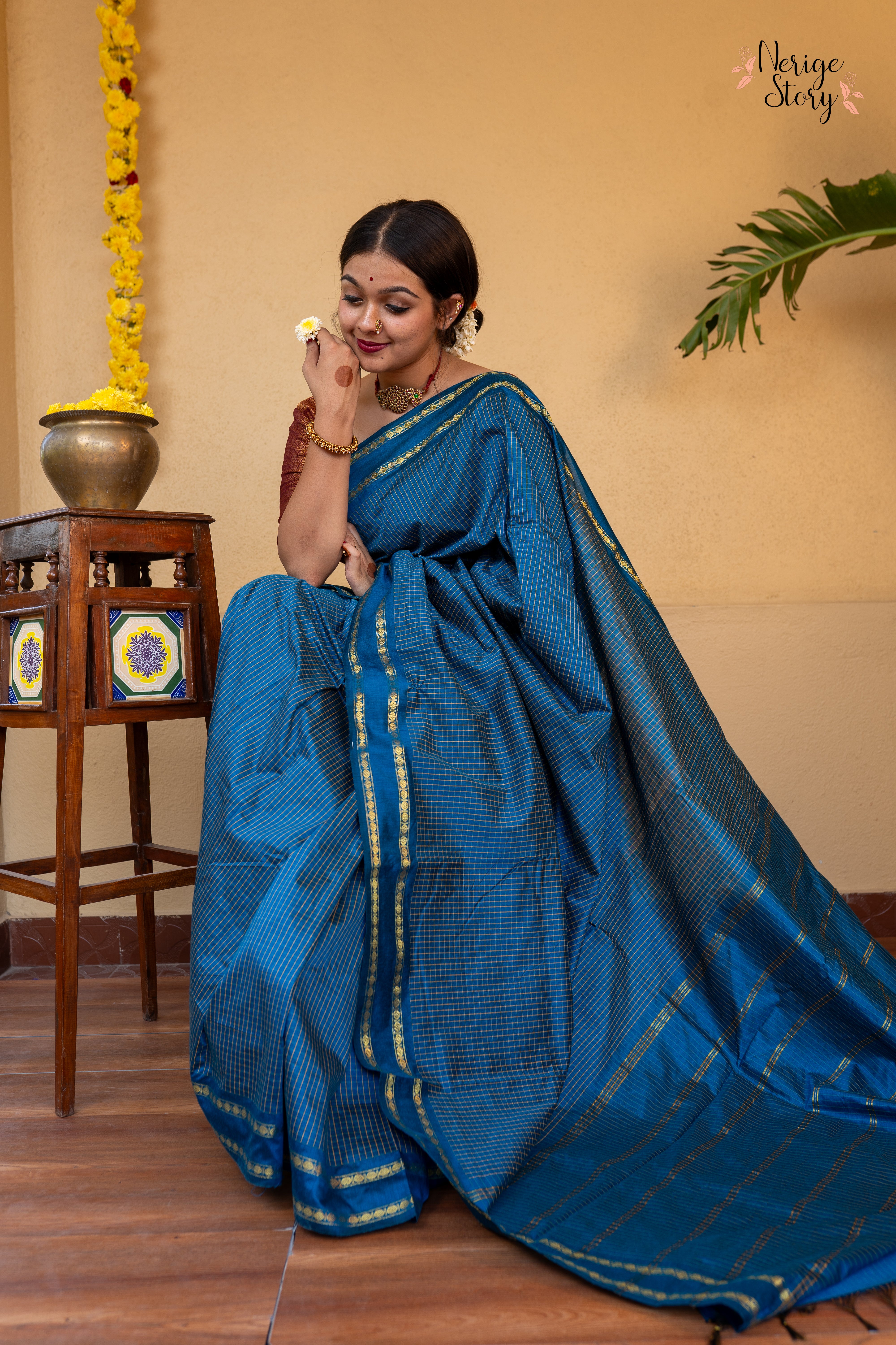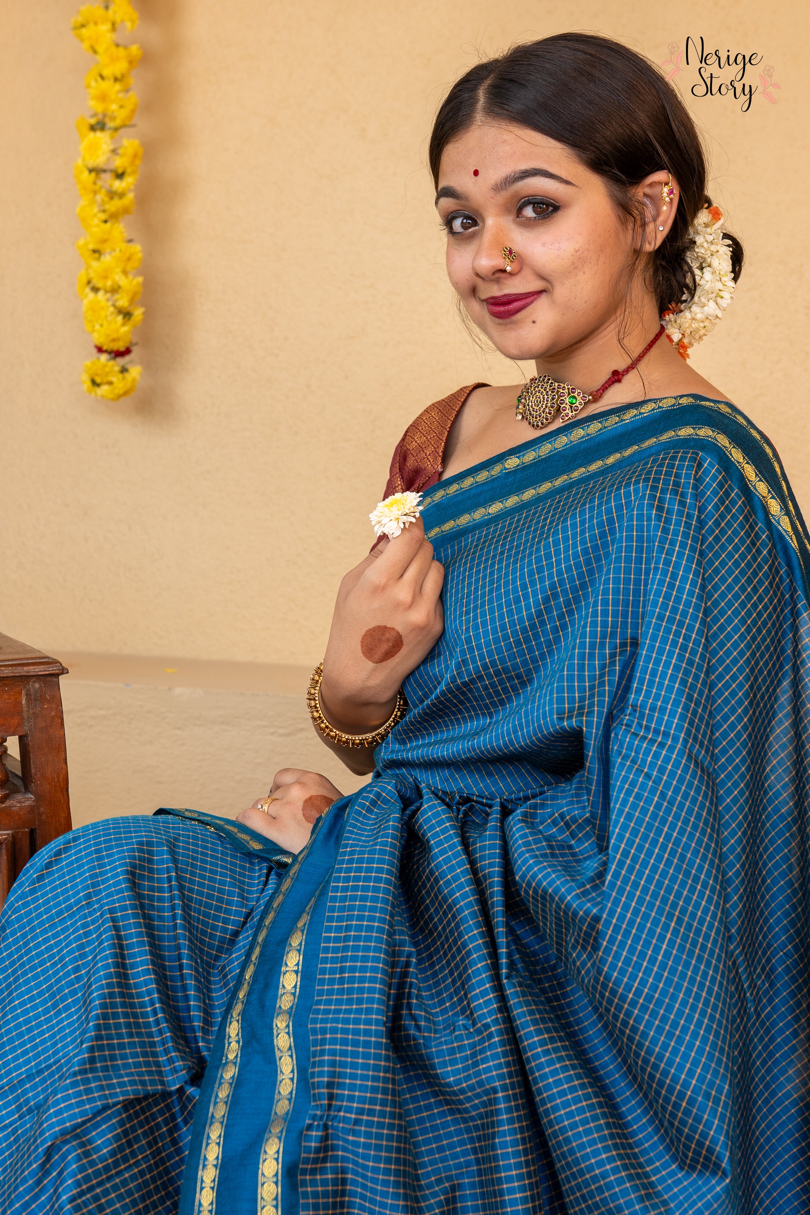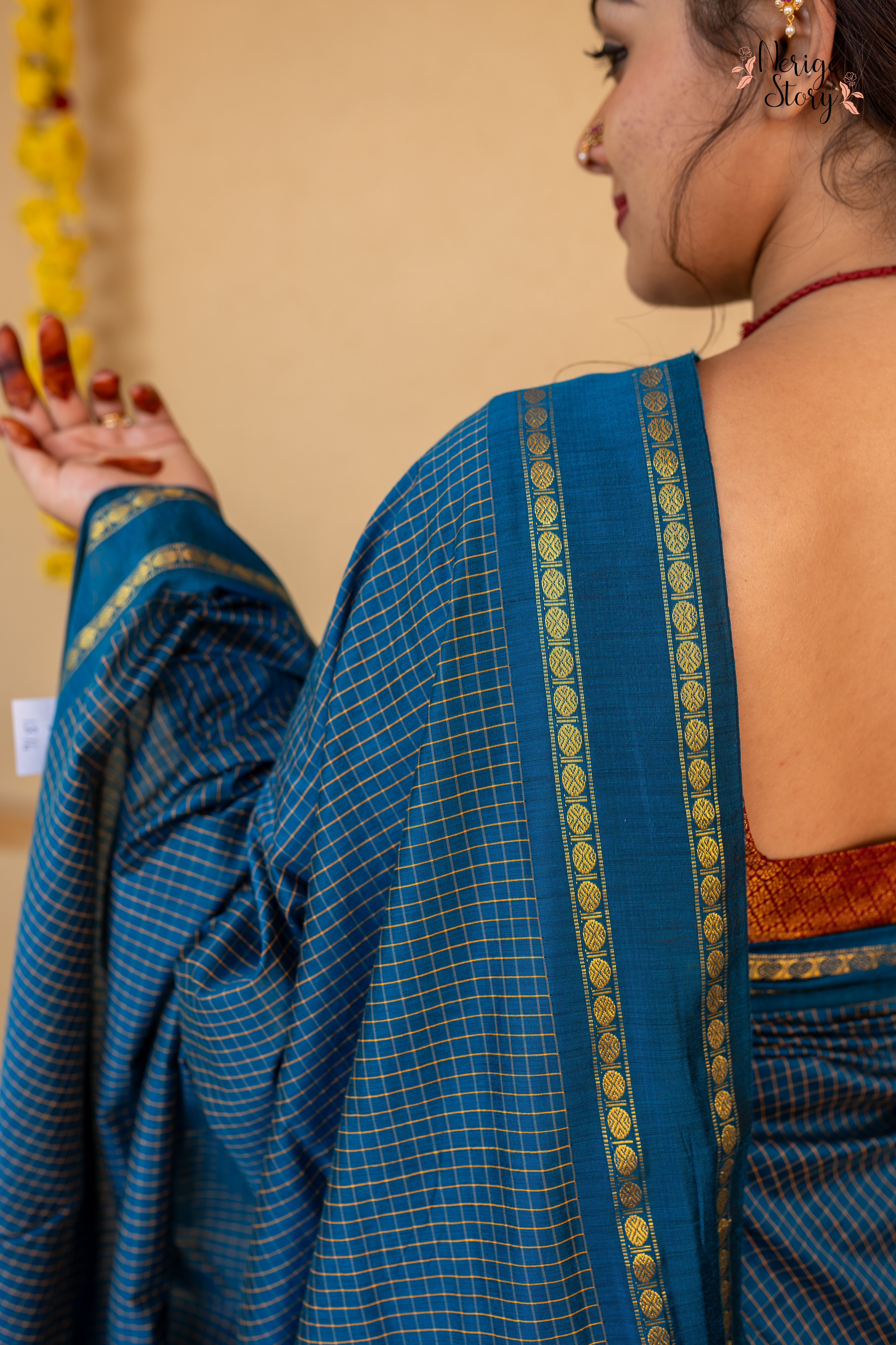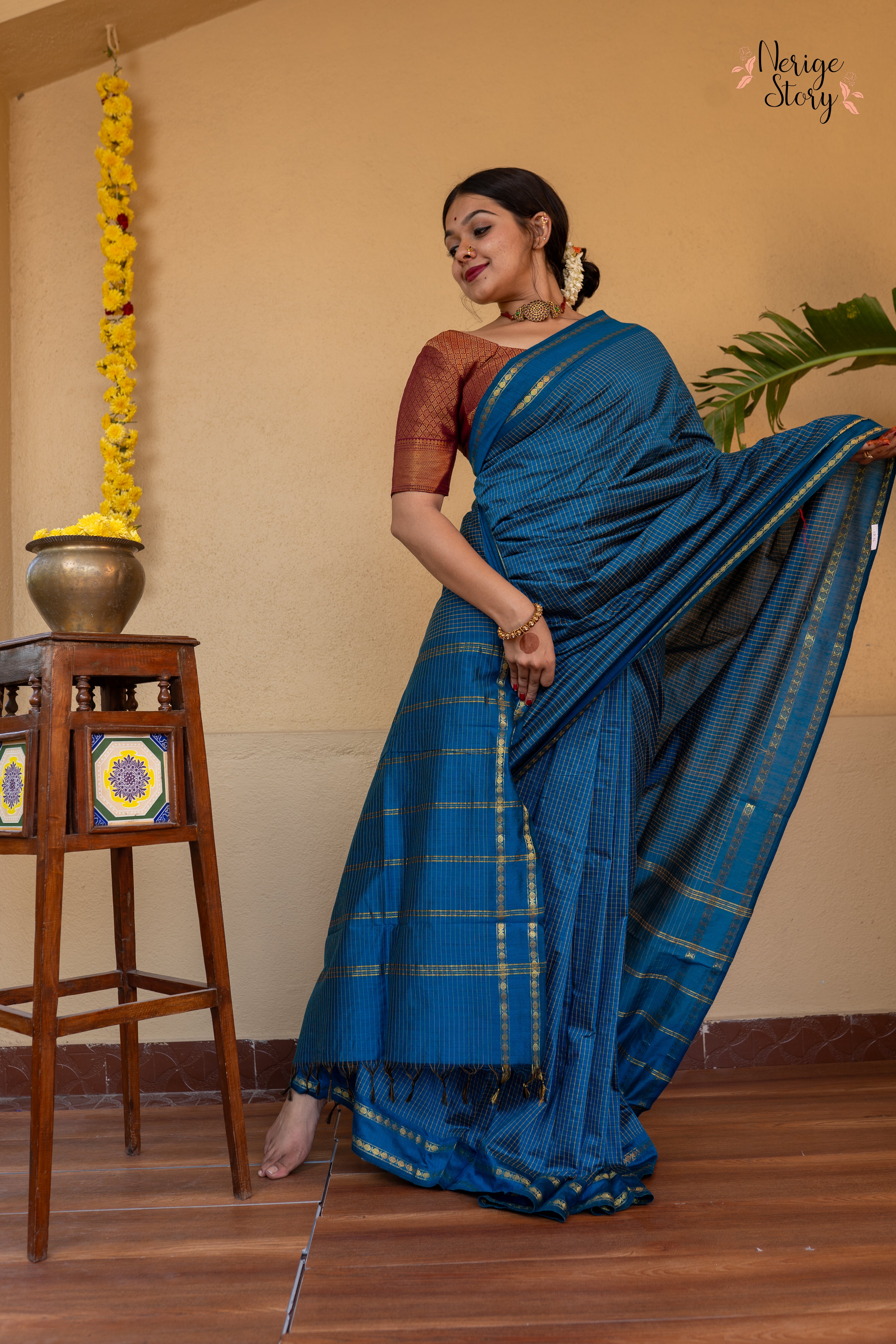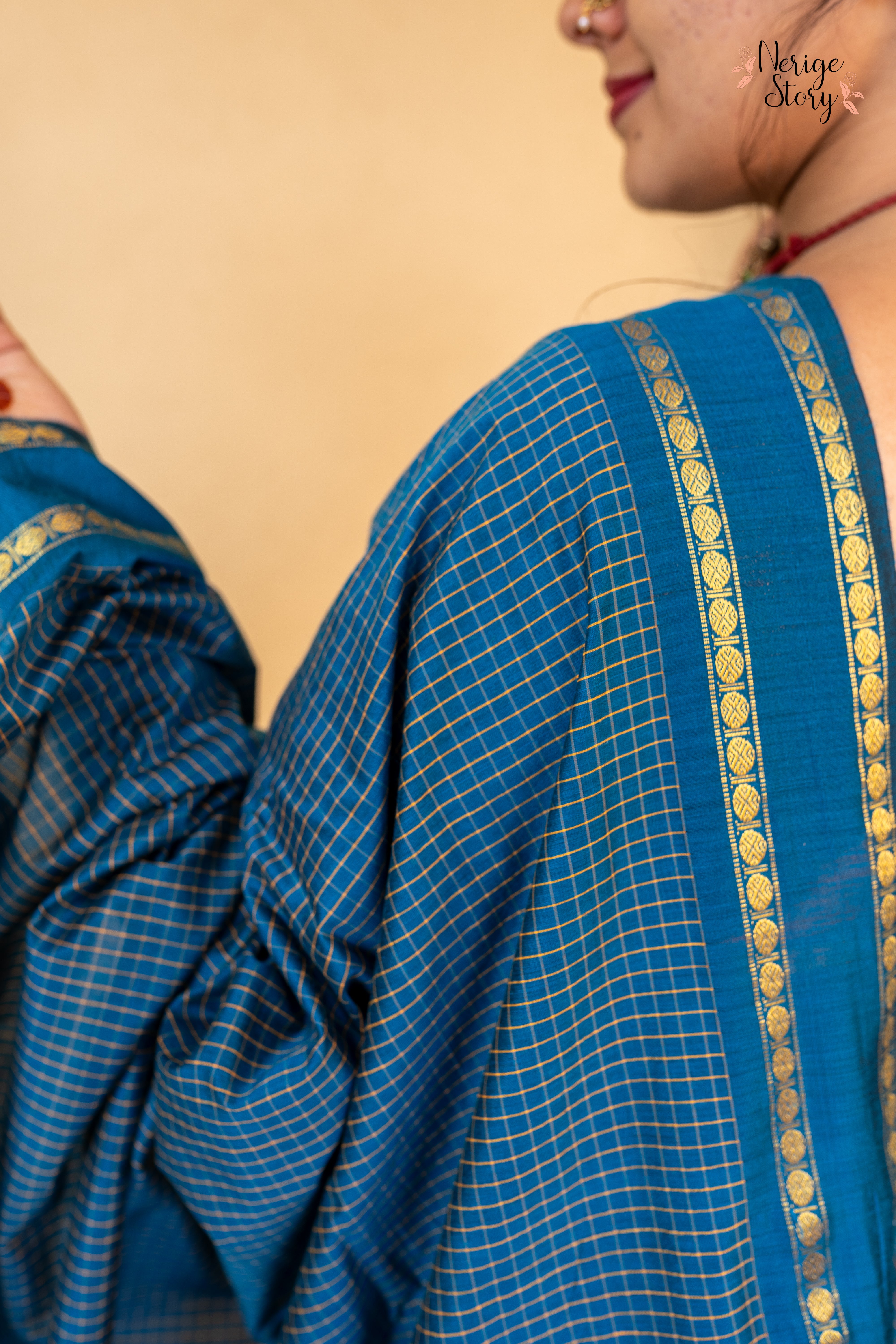 From its lovely blue chequered silk cotton base, to its double gold zari border and woven Rudraksham motifs, this stunning saree is certain to add a touch of sophistication and exclusivity to any ensemble.
