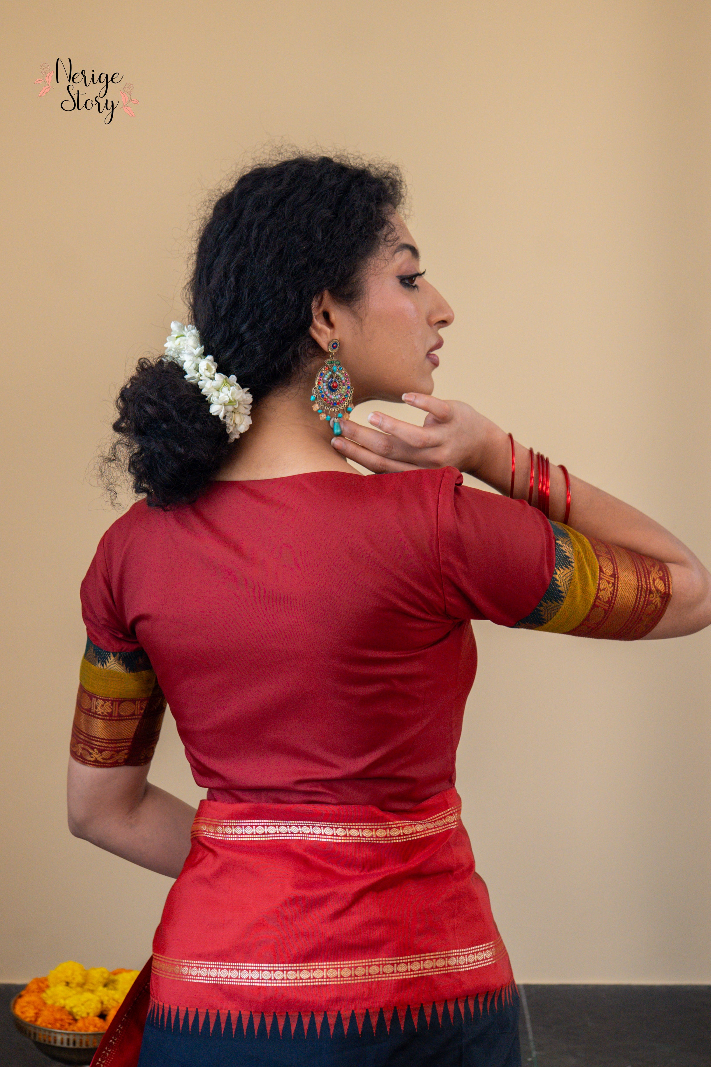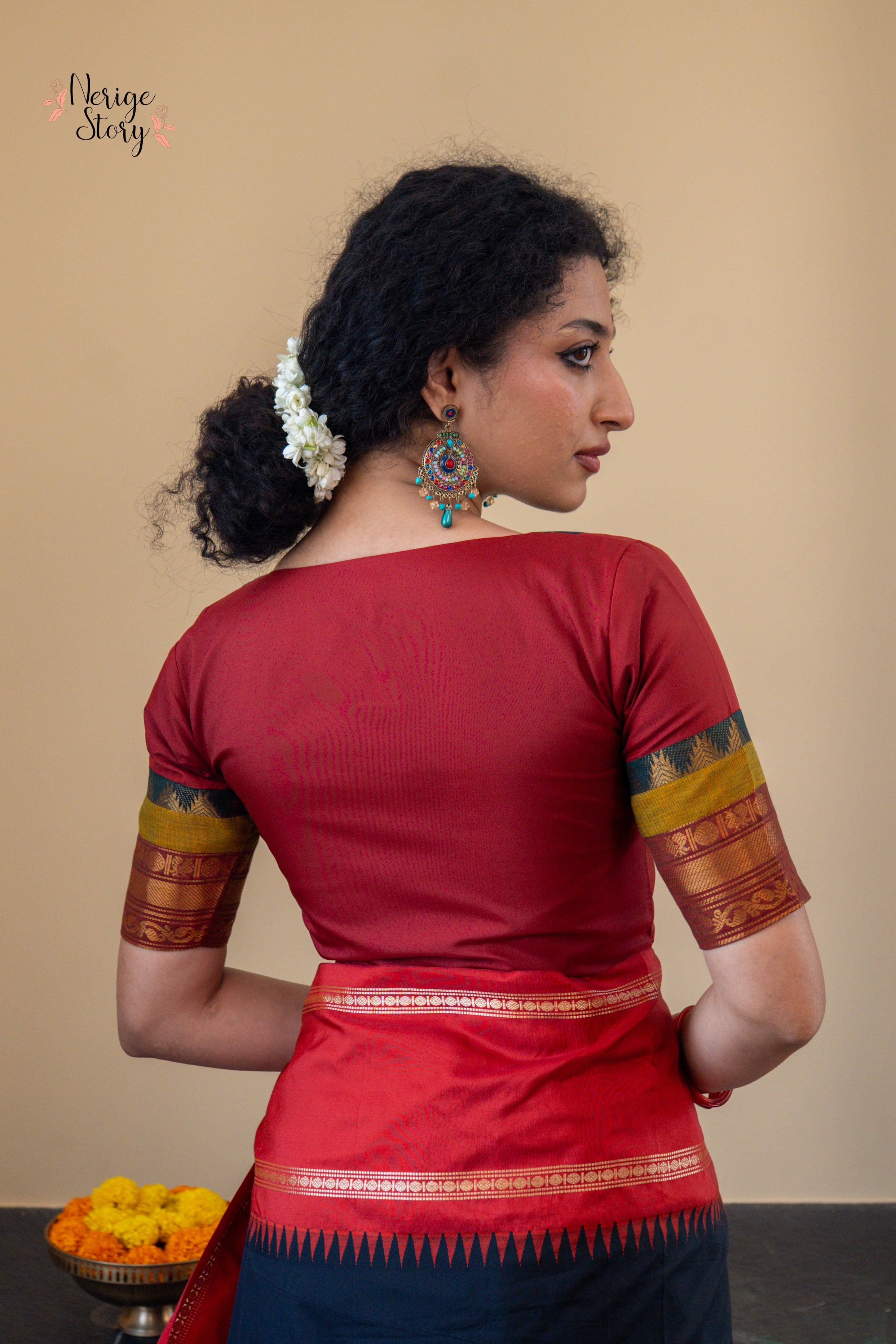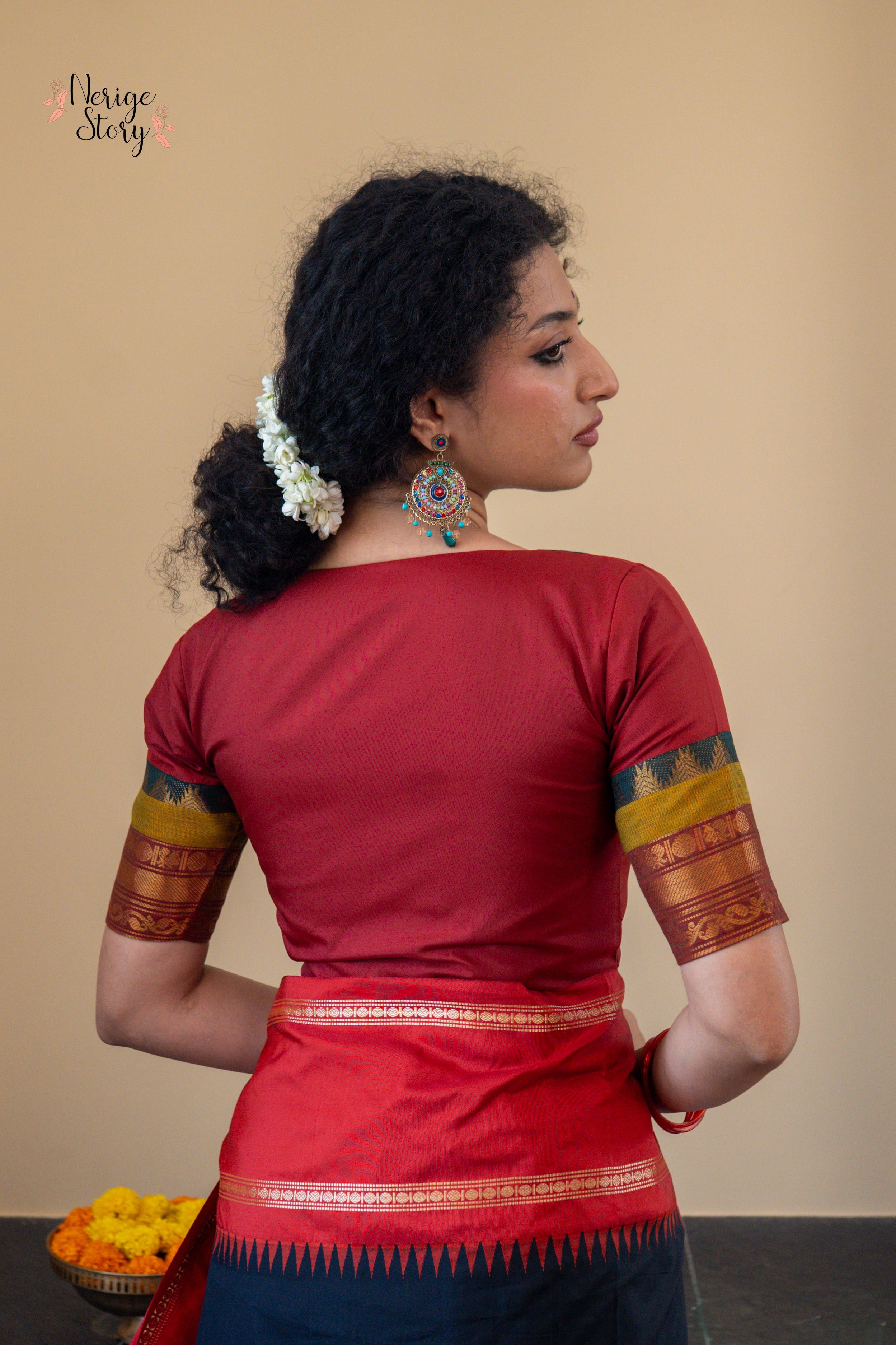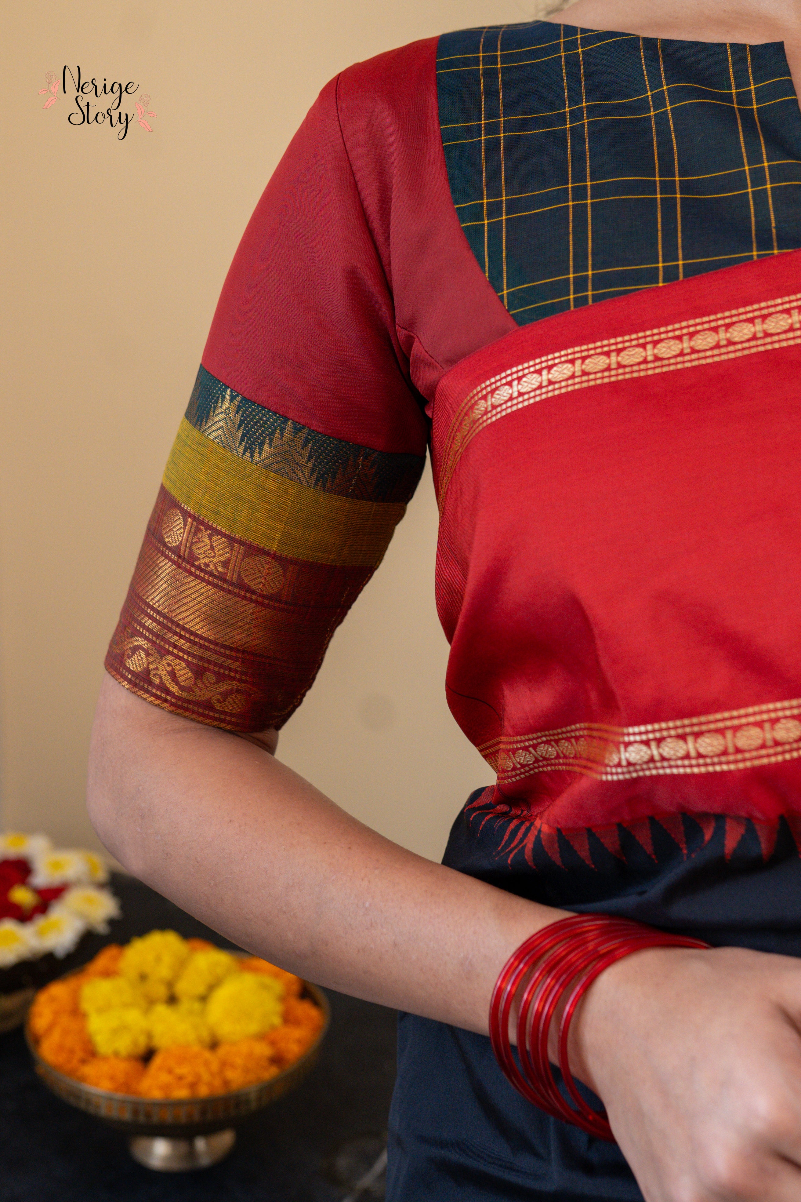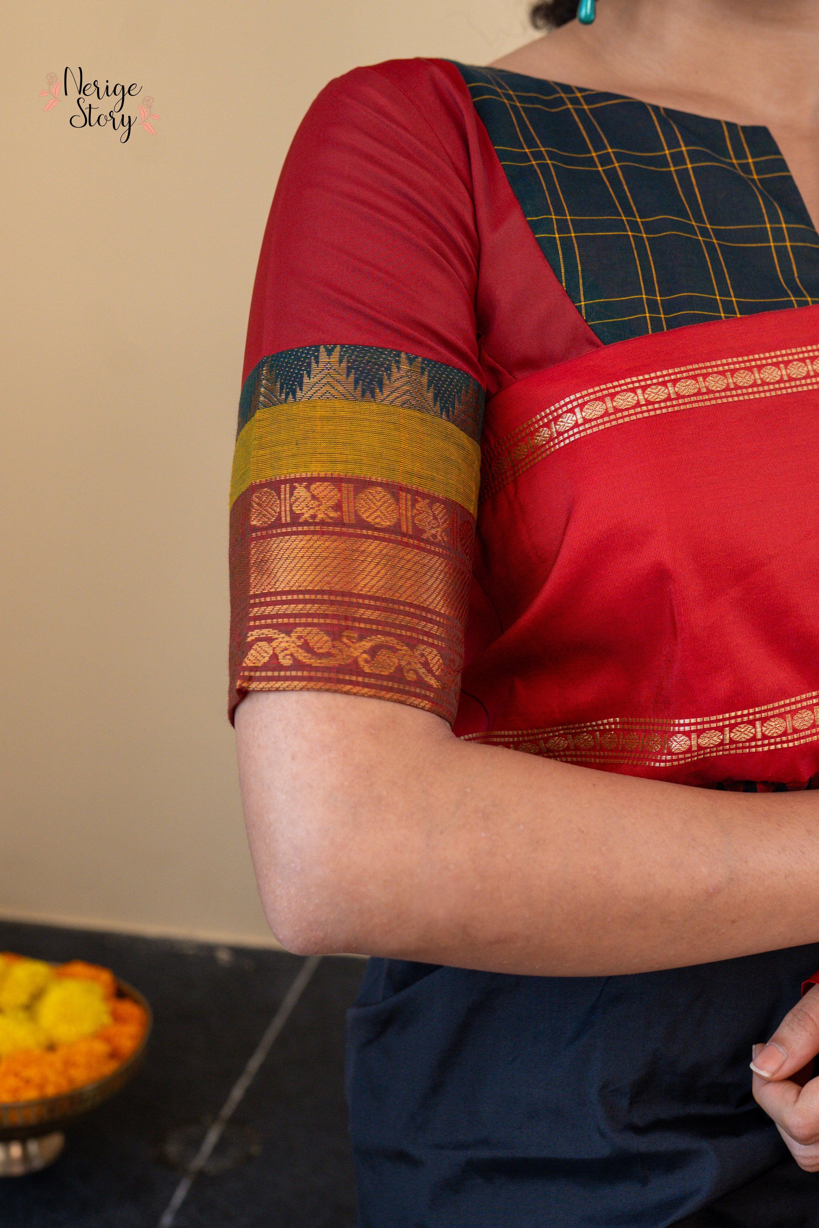 A striking red semi-Bangalore silk blouse featuring a unique green chequered cotton neckline — a beautiful blend of textures and tradition. The elbow-length sleeves are finished with a rich gold zari border, adding just the right amount of festive shimmer.