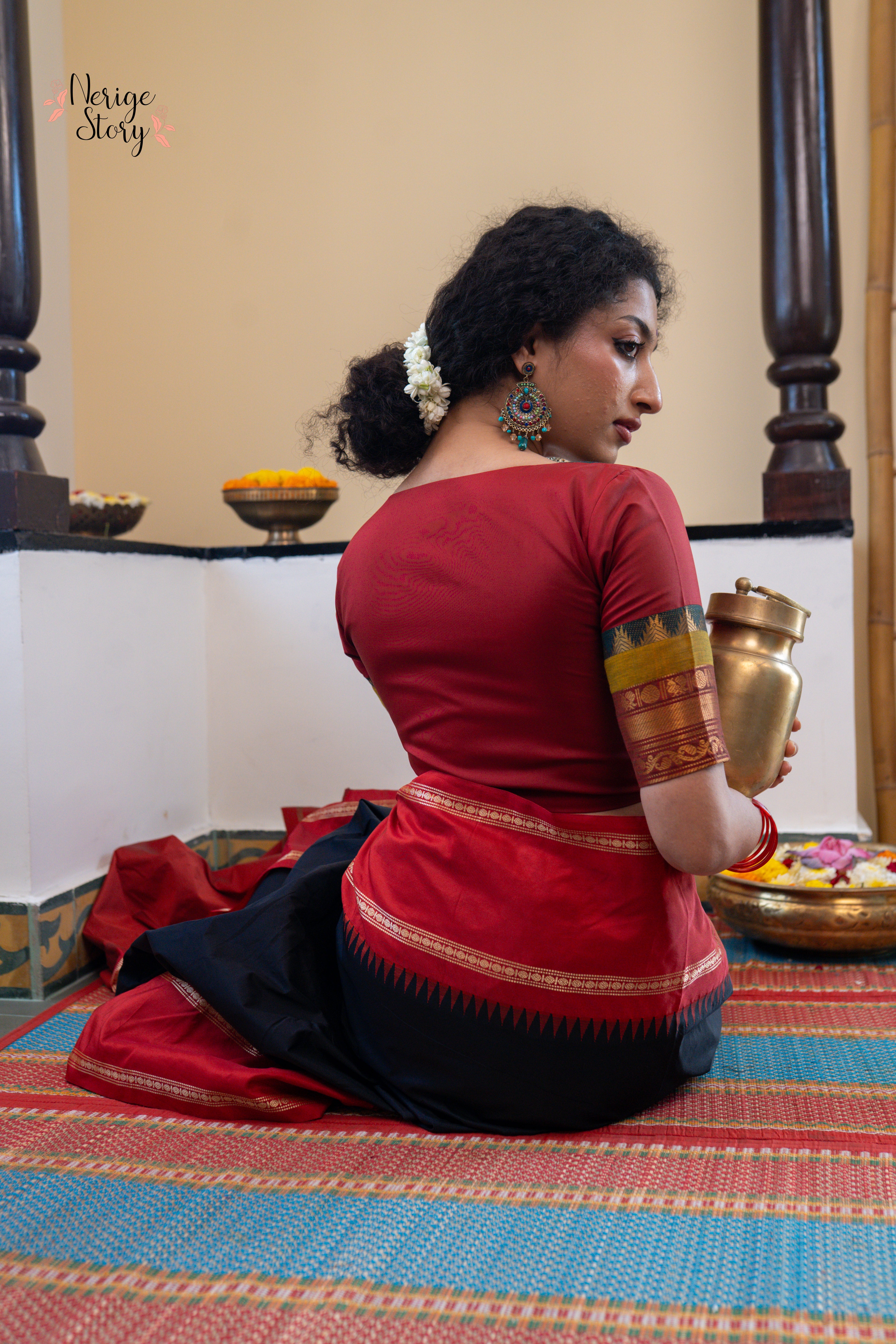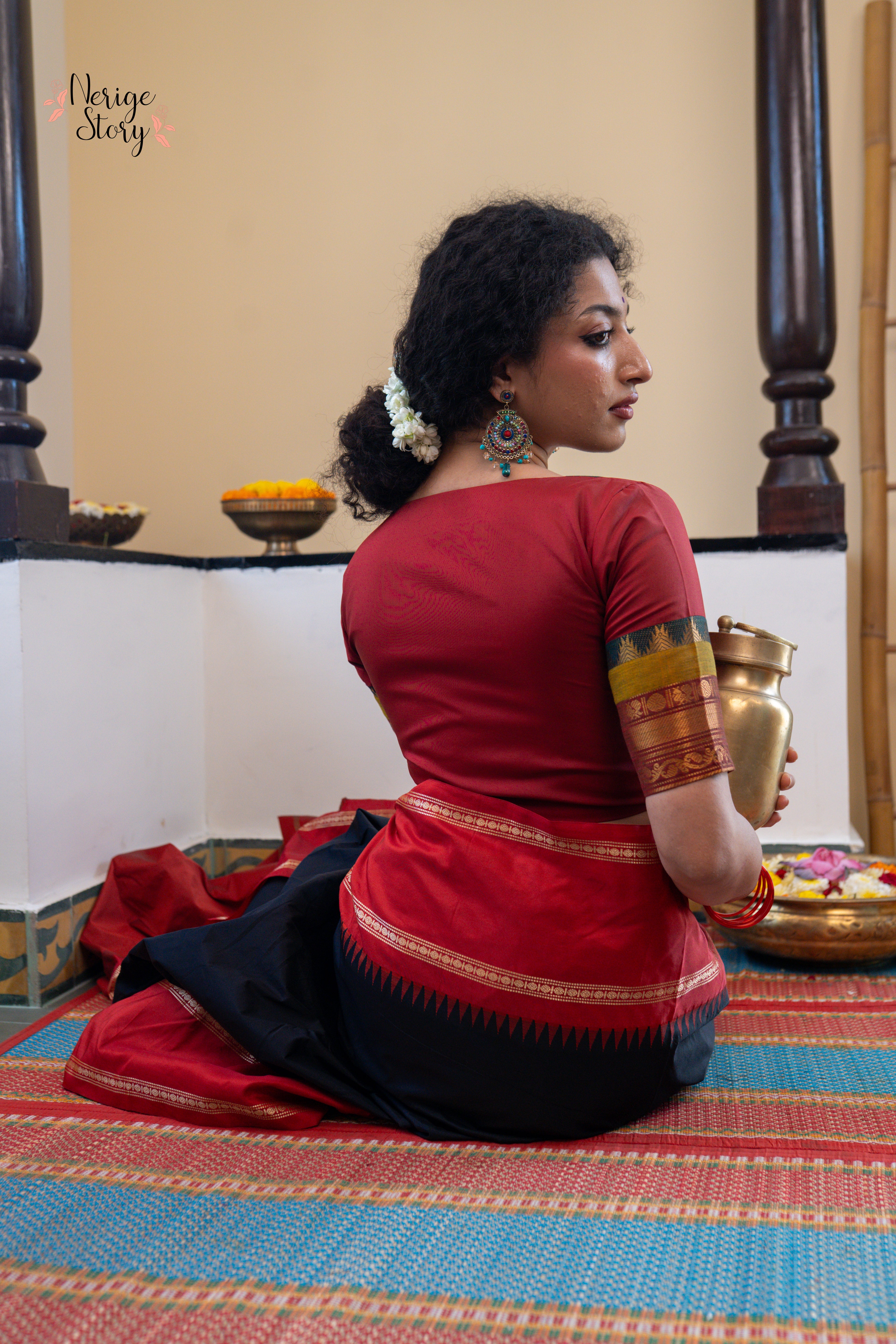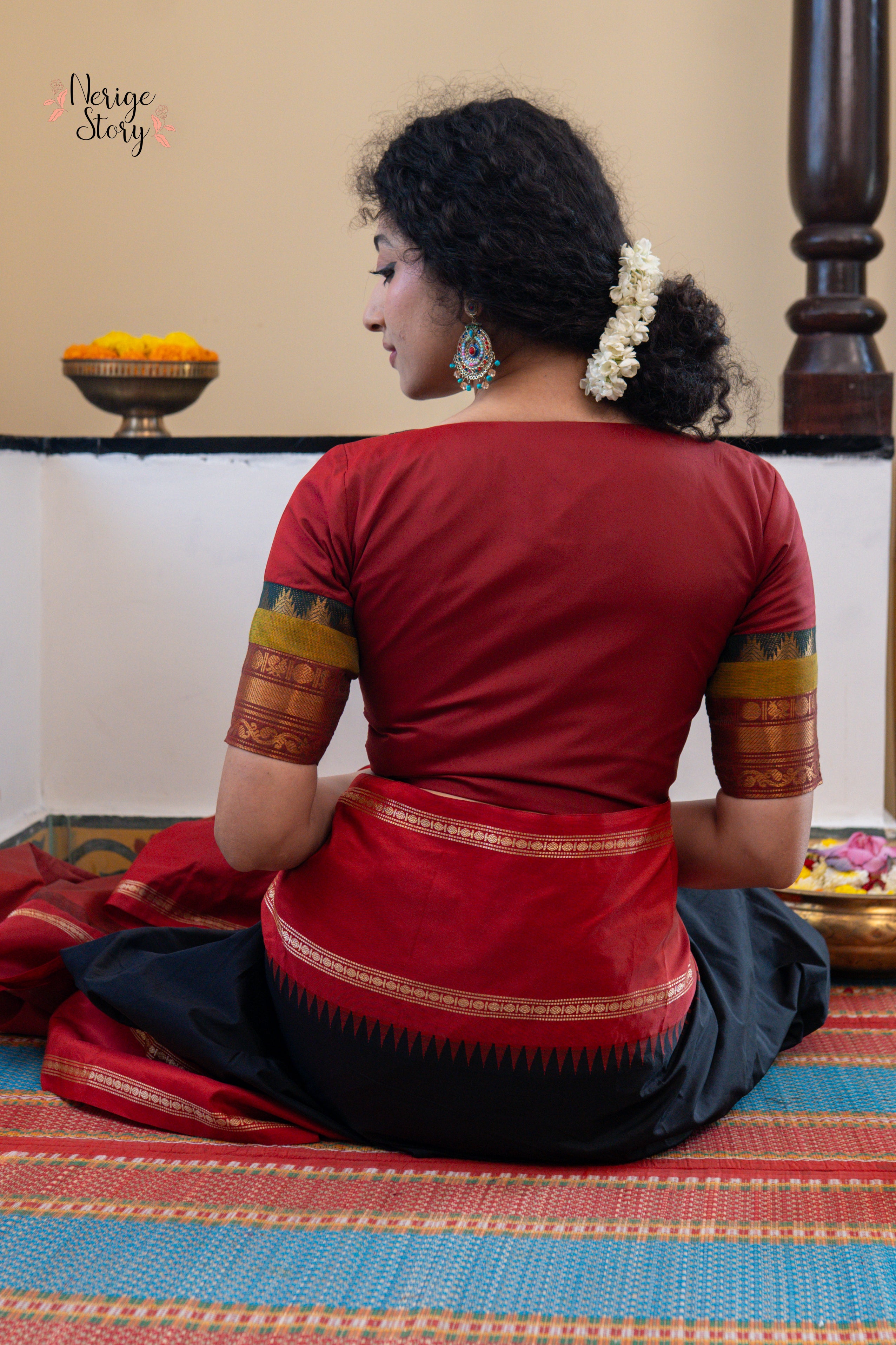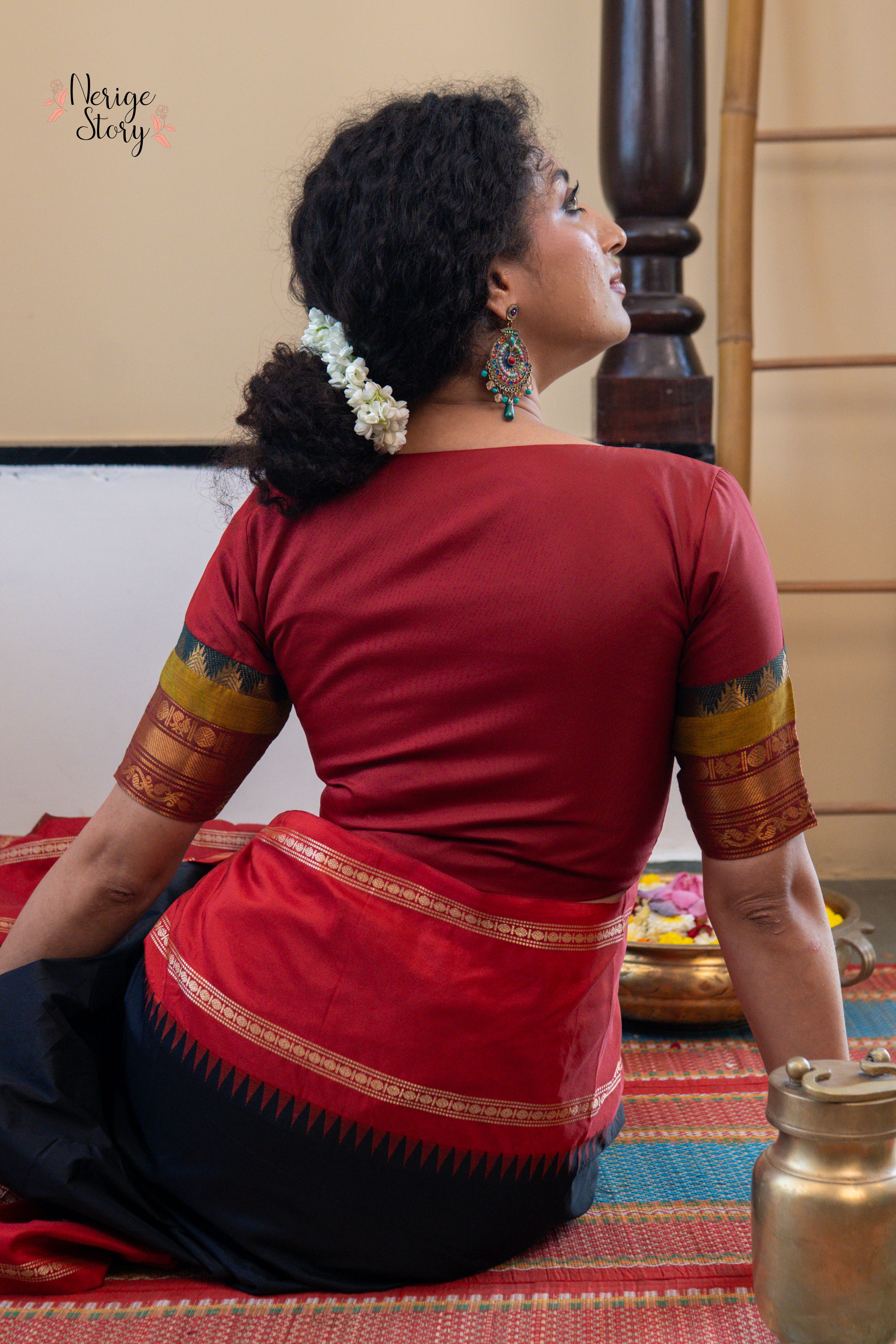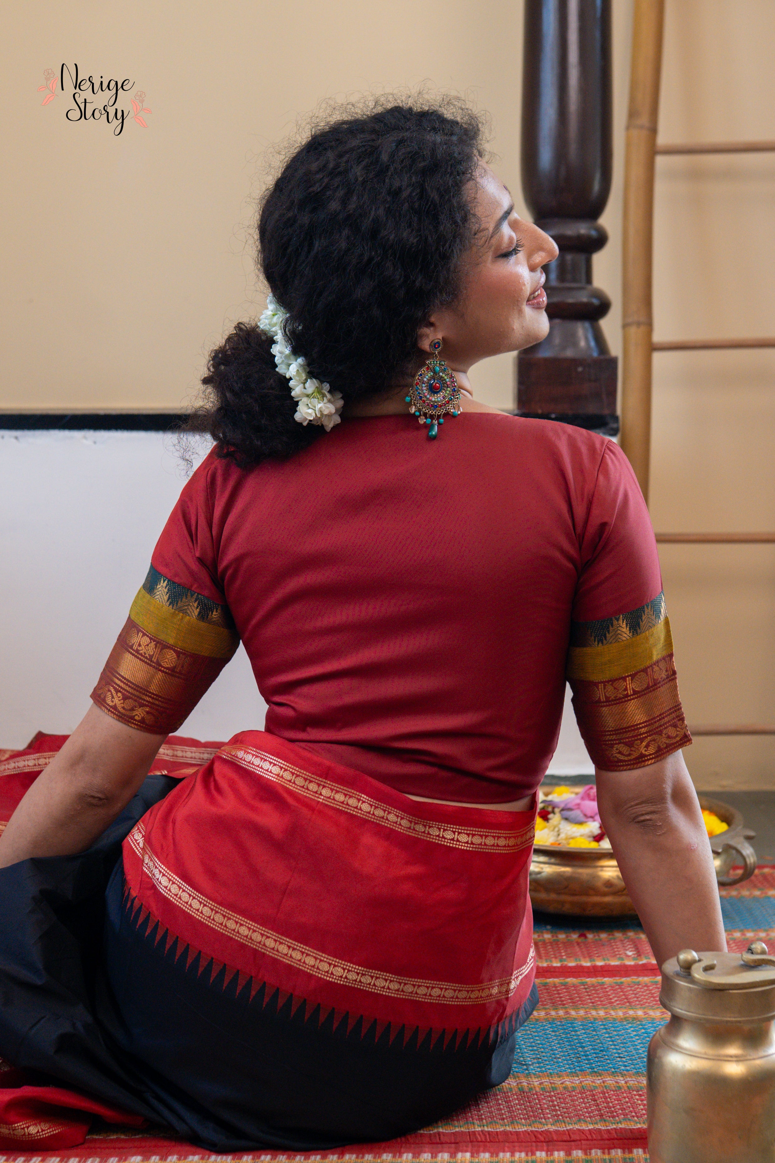 A striking red semi-Bangalore silk blouse featuring a unique green chequered cotton neckline — a beautiful blend of textures and tradition. The elbow-length sleeves are finished with a rich gold zari border, adding just the right amount of festive shimmer.