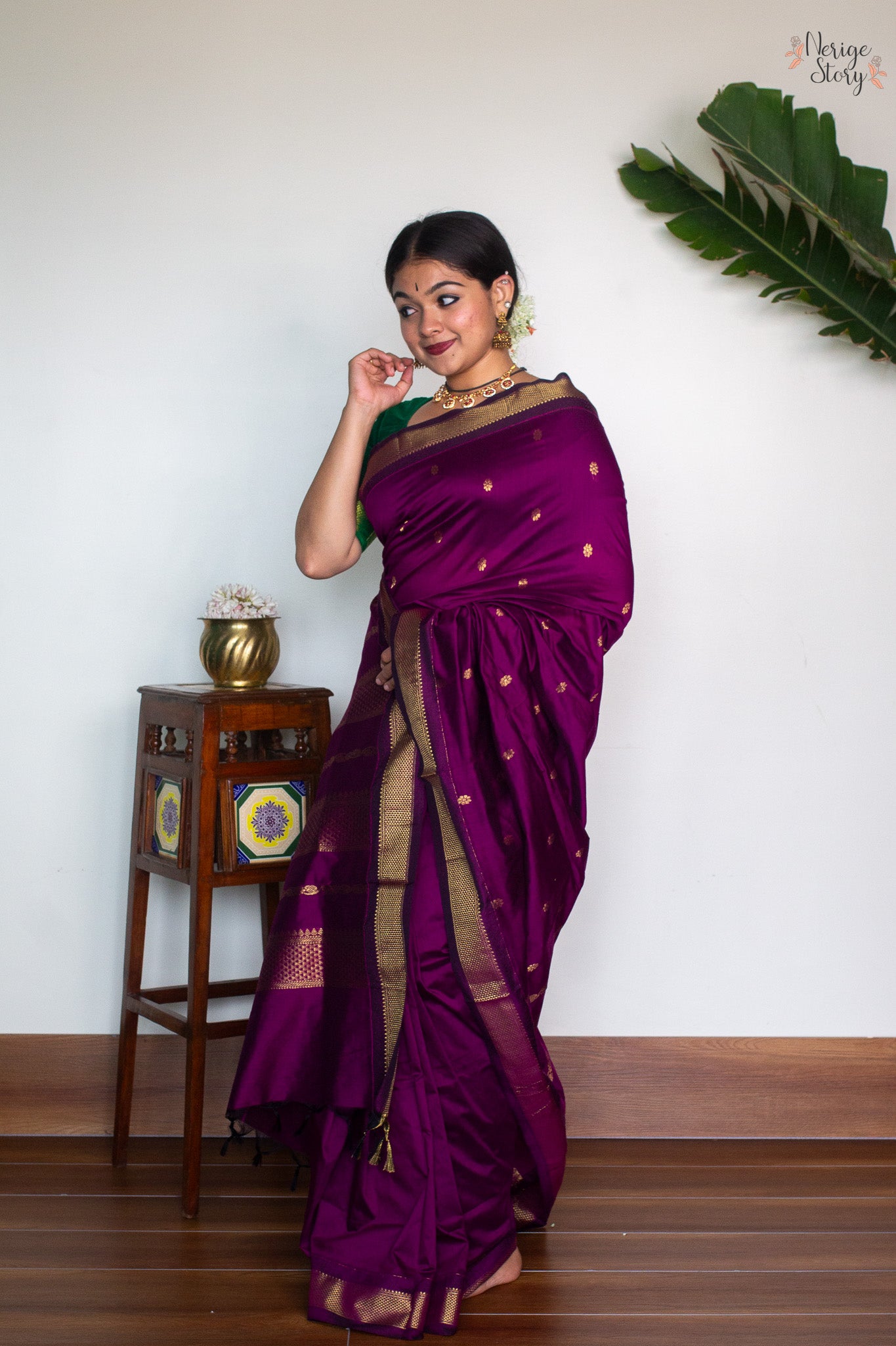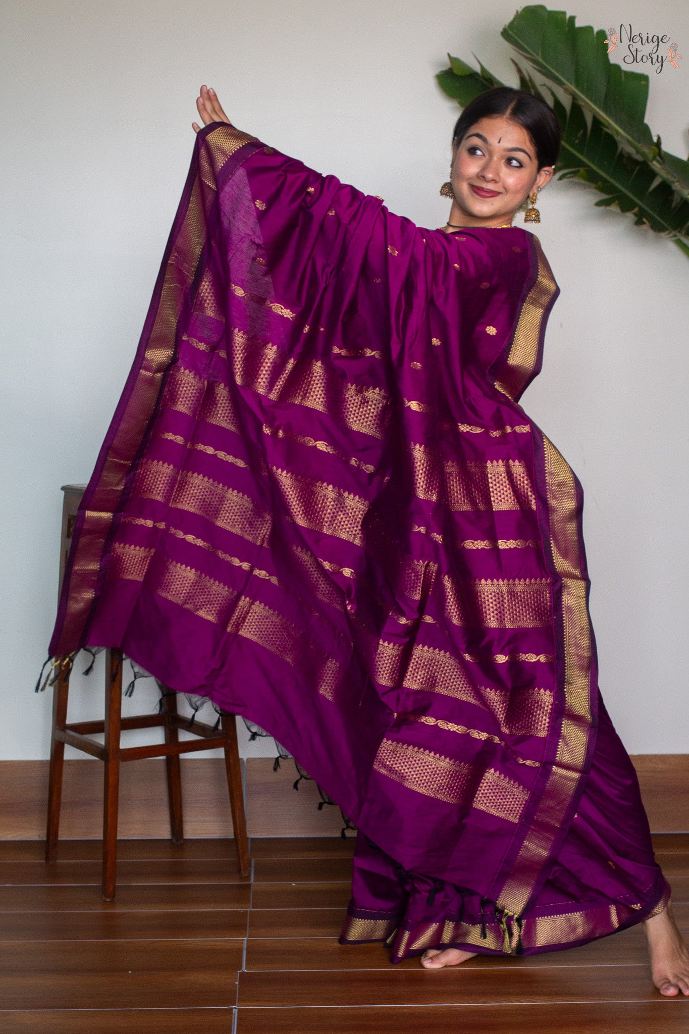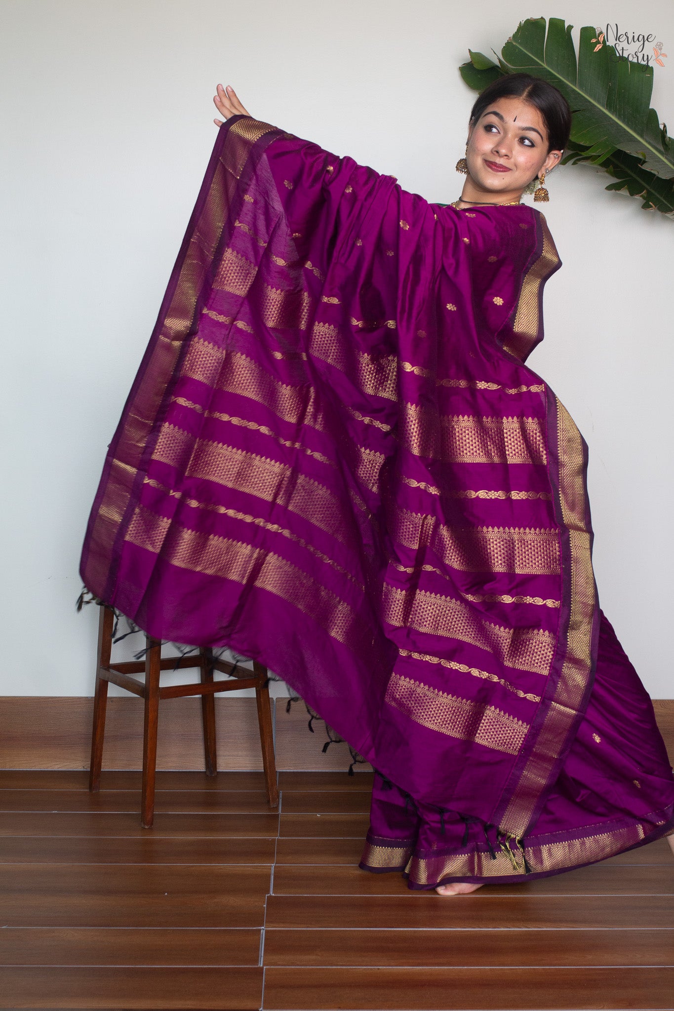 Make a statement with this luxurious dark magenta cotton blend saree, boasting a timeless magenta and gold zari border. Subtle gold floral buttas adorn the body of the saree, creating an opulent, exclusive look, perfect for special occasions. The plain magenta blouse with a border compliments the saree, adding a hint of sophistication.