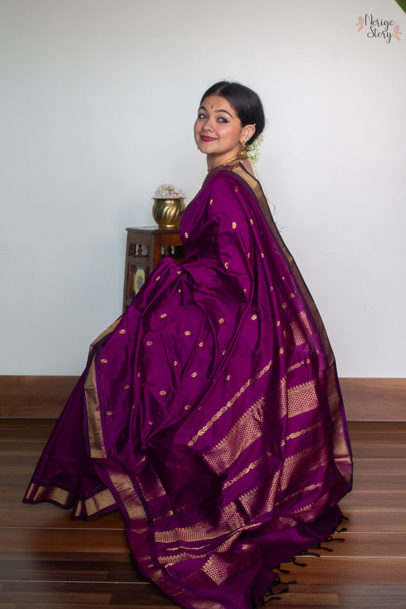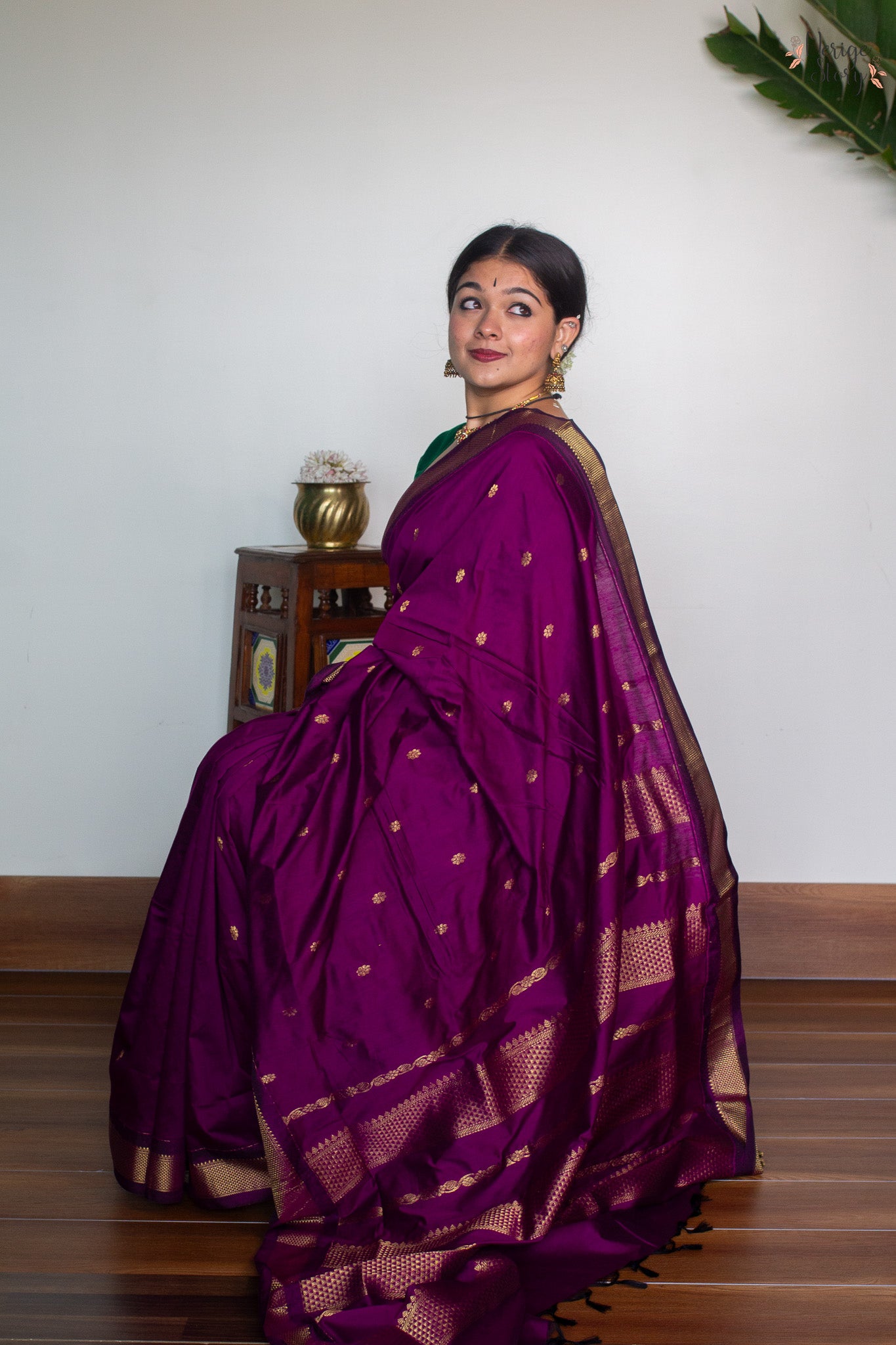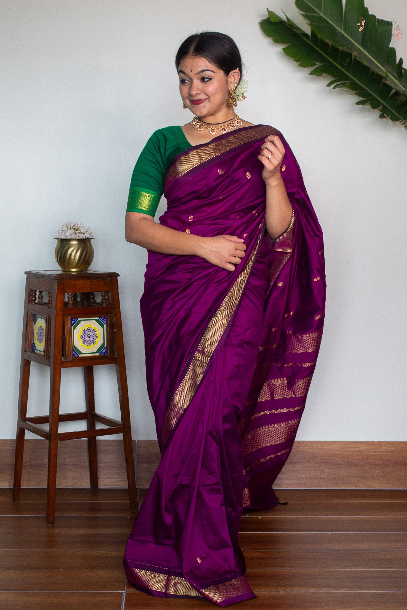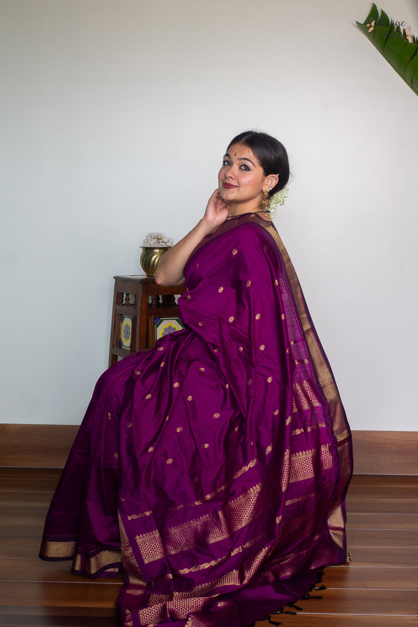 Make a statement with this luxurious dark magenta cotton blend saree, boasting a timeless magenta and gold zari border. Subtle gold floral buttas adorn the body of the saree, creating an opulent, exclusive look, perfect for special occasions. The plain magenta blouse with a border compliments the saree, adding a hint of sophistication.