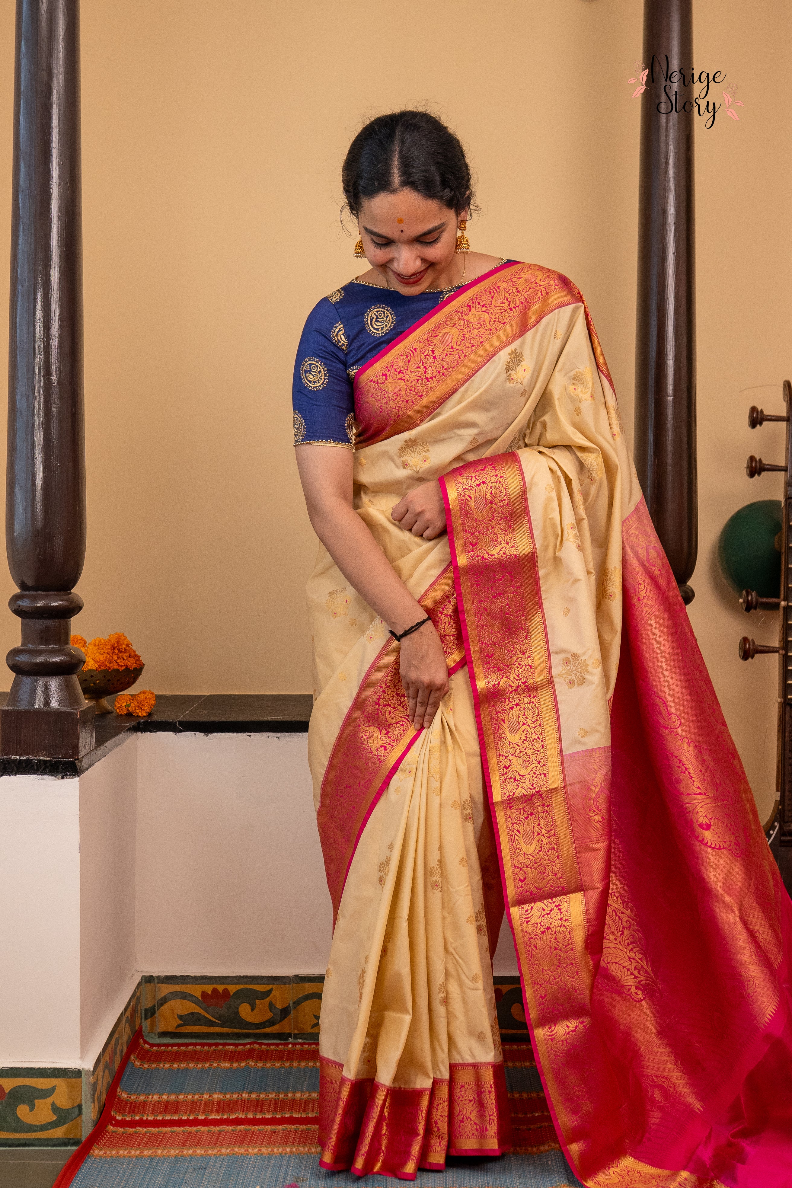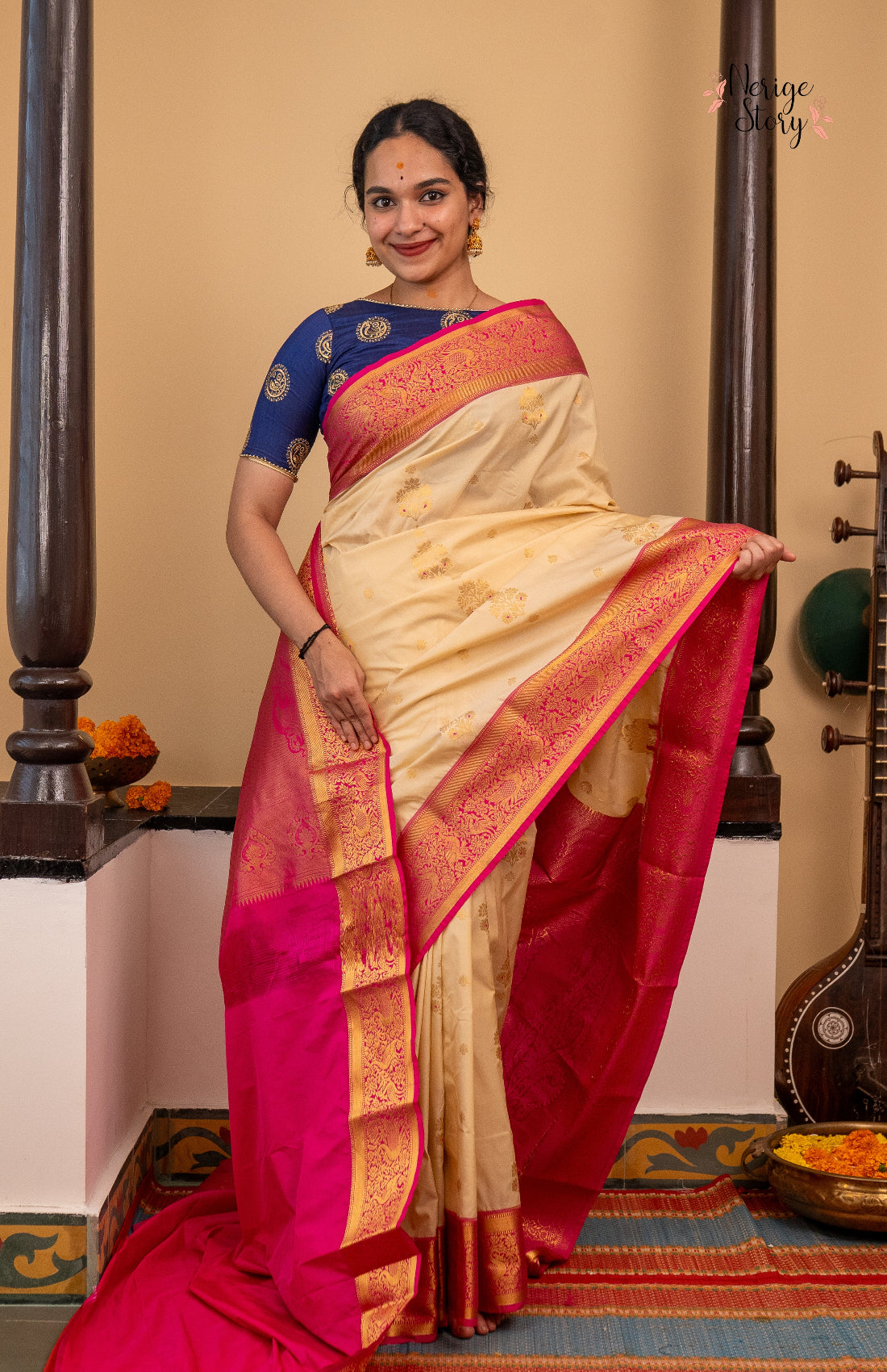 A stunning light beige semi-bangalore silk saree with a rich pink border and pallu featuring intricate gold zari weaving. The body has subtle golden and pink floral motifs, adding elegance and charm to the overall look.