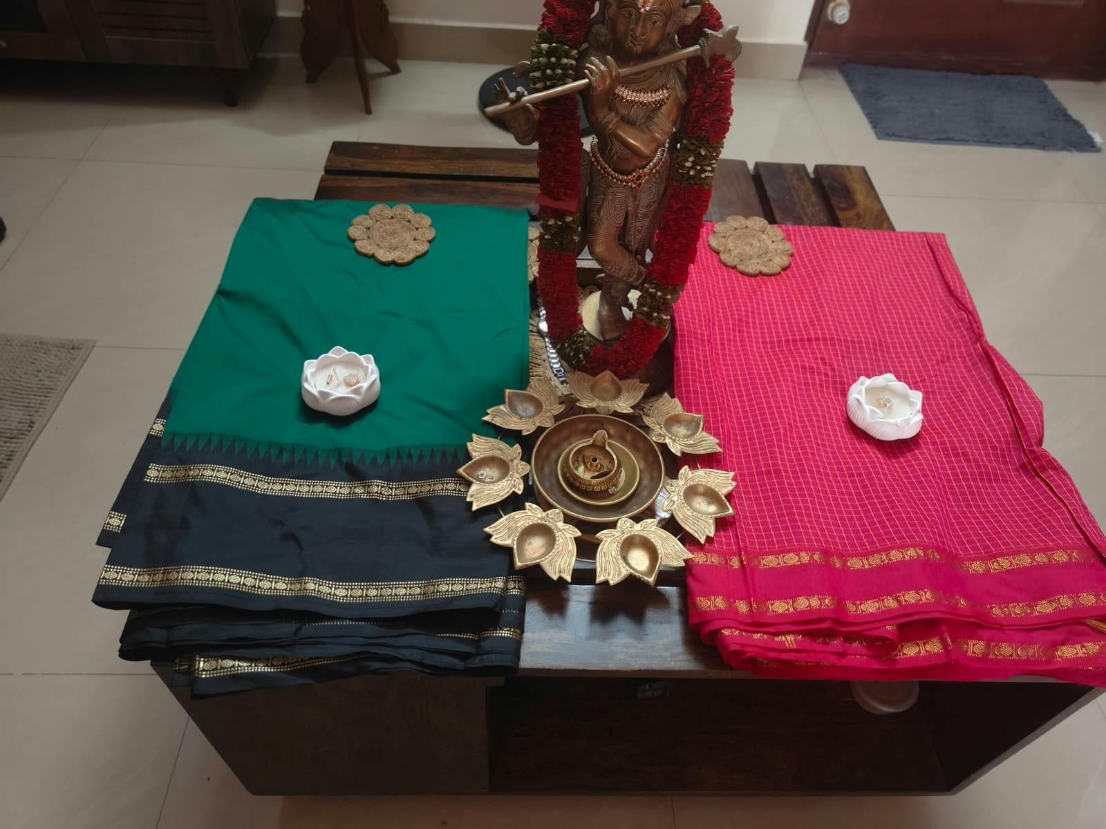 A stunning forest green semi Bangalore silk saree with a black border and a gold zari border with rudraksham motifs. The saree has a rich black pallu with gold zari.