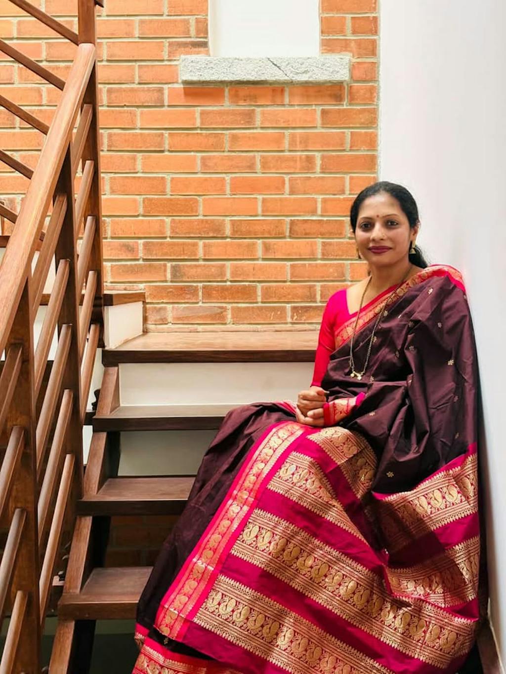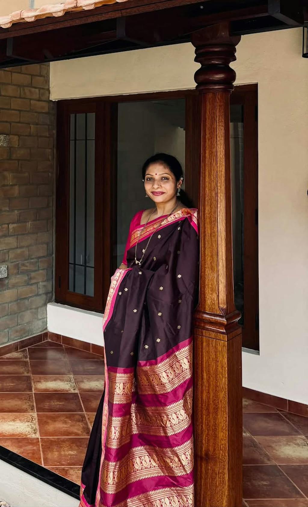 A stunning dark brown semi Bangalore silk saree with a dark pink border and a peacock gold zari border. the body of the saree has beautiful gold zari buttas and a dark pink pallu with gold zari stripes.