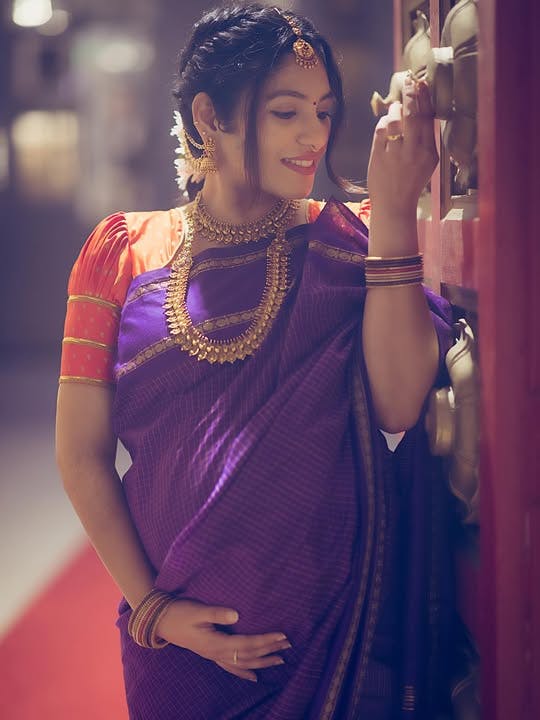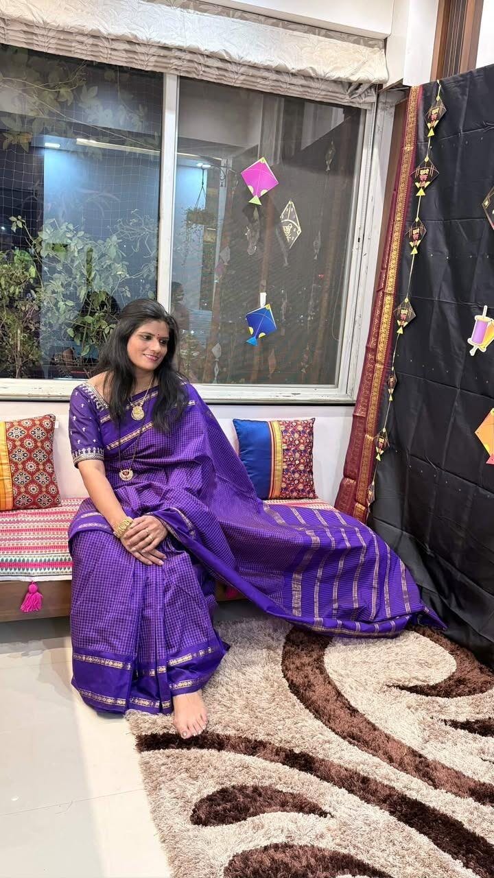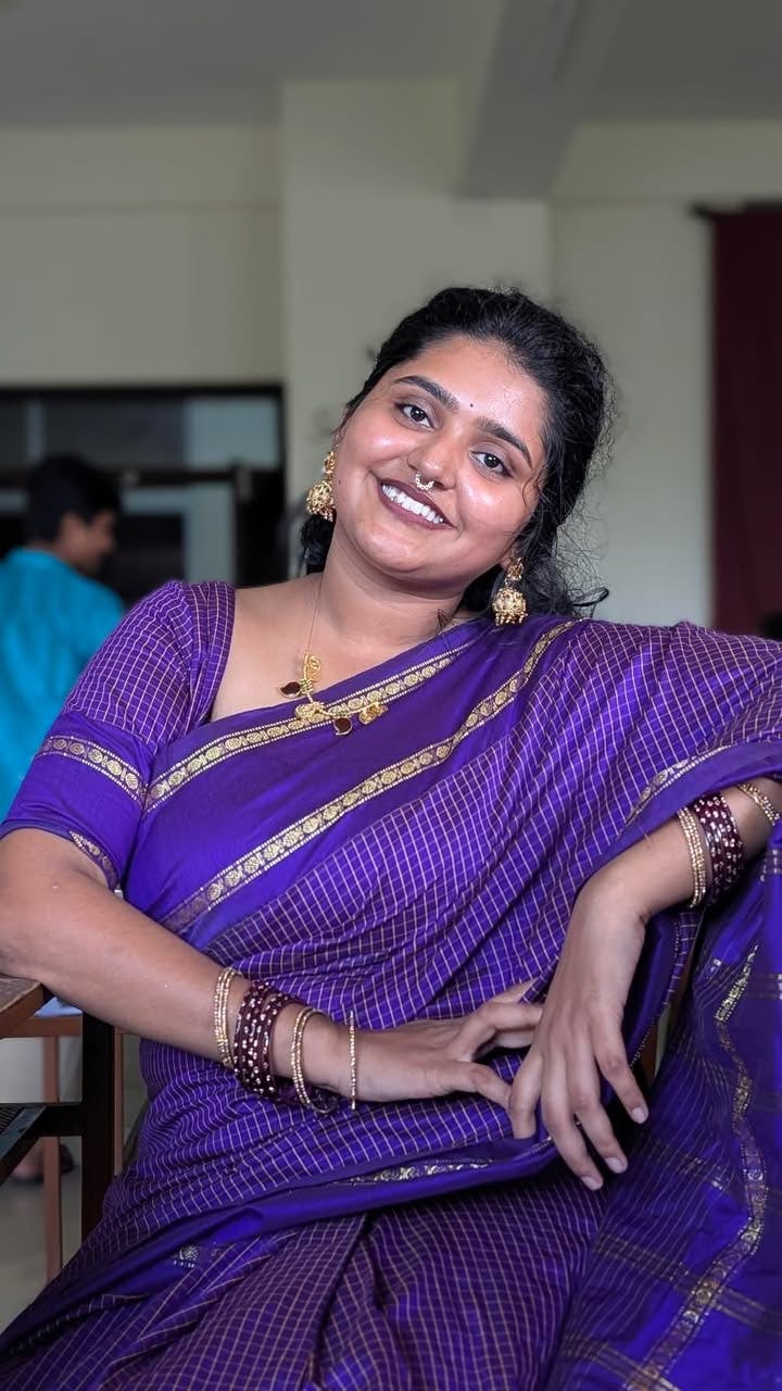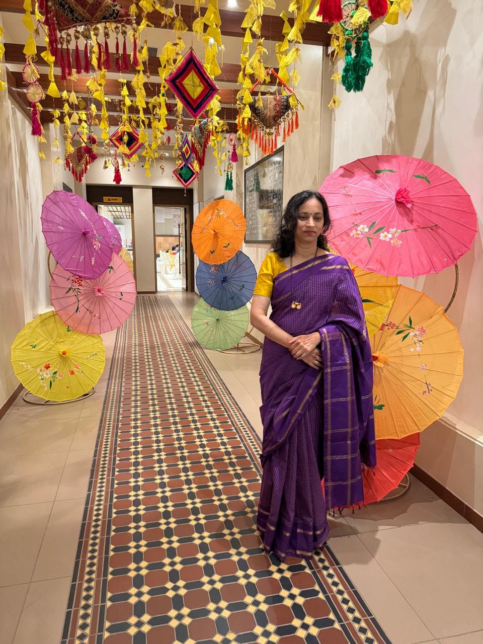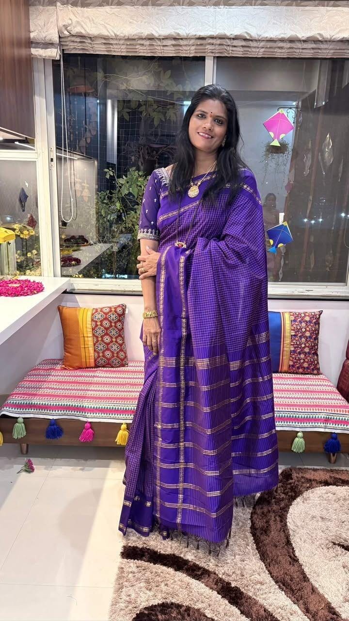 Introducing DHENUKA (தேனுகா) – crafted for those looking to express their incomparable style sans compromise. A lovely purple chequered cotton blend saree with a double gold zari border and woven Rudraksham motifs, this stunning saree is certain to add a touch of sophistication and exclusivity to any ensemble. The pallu includes subtle gold zari stripes that draw the eye, creating an unforgettable look.