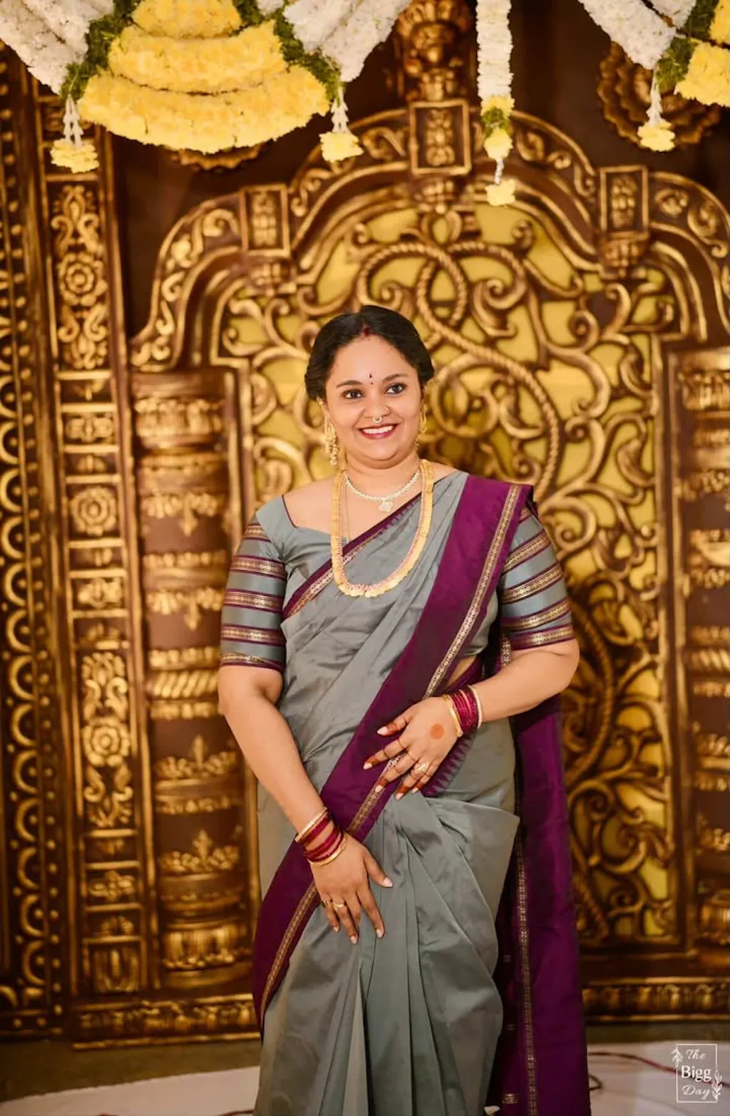 A stunning grey semi Bangalore silk saree with a dark purple border and a gold zari border with rudraksham motifs. The saree has a rich dark purple pallu with gold zari.