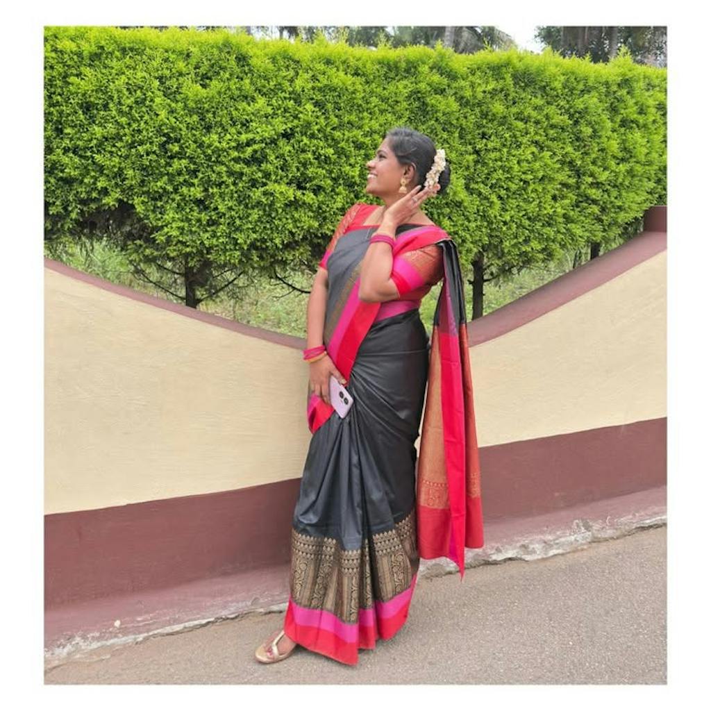 A beautiful black semi-kataan silk saree with a beautiful gold zari border. The saree has rich gold zari on one side of the border.The saree has a beautiful orange & pink satin border and a rich red pallu with gold zari.