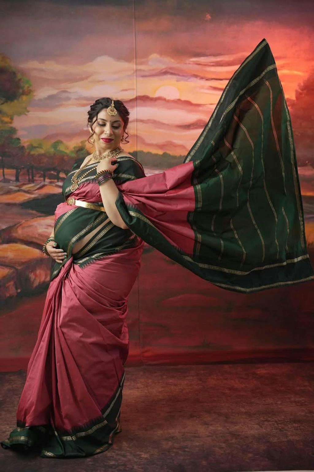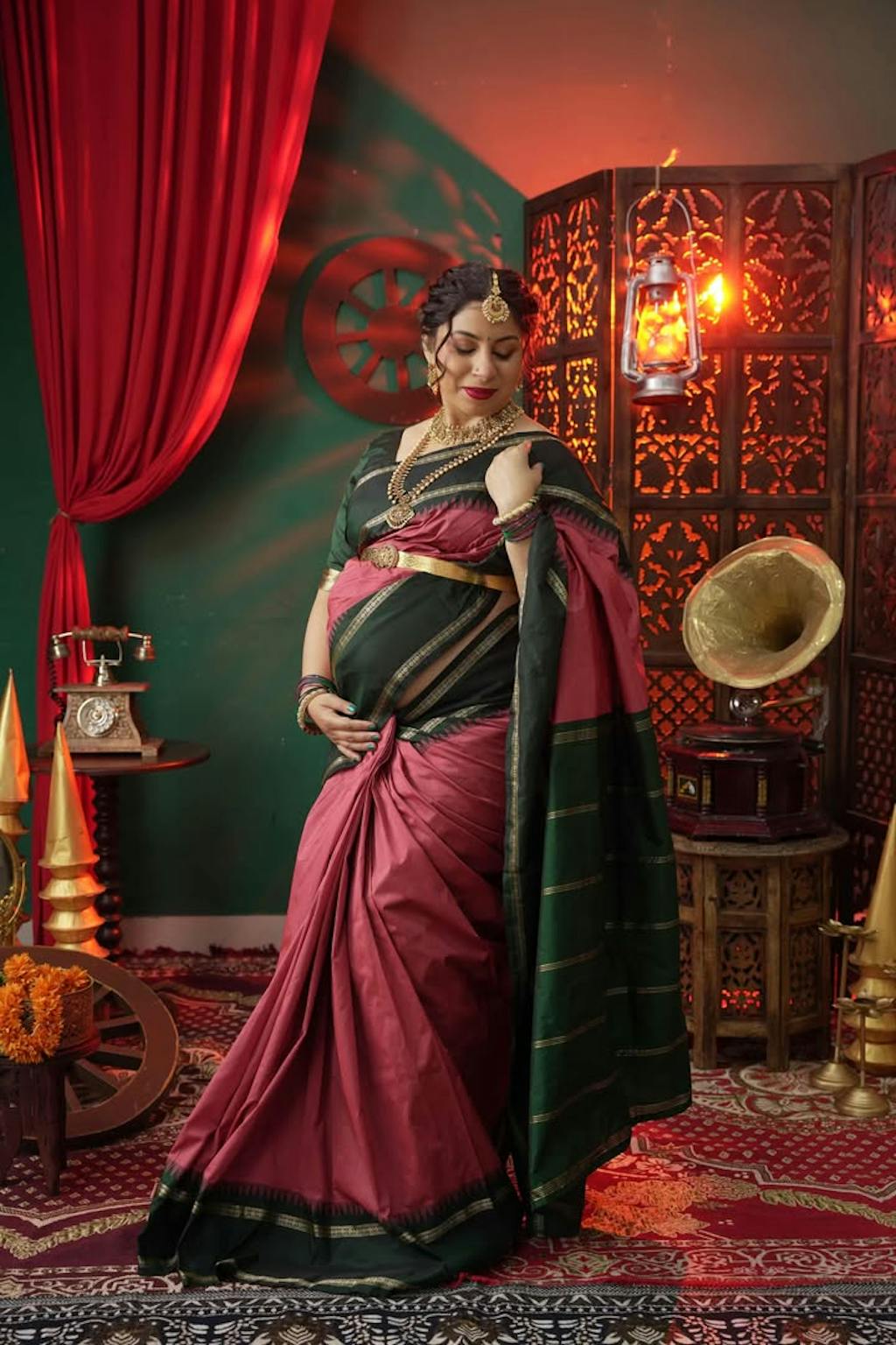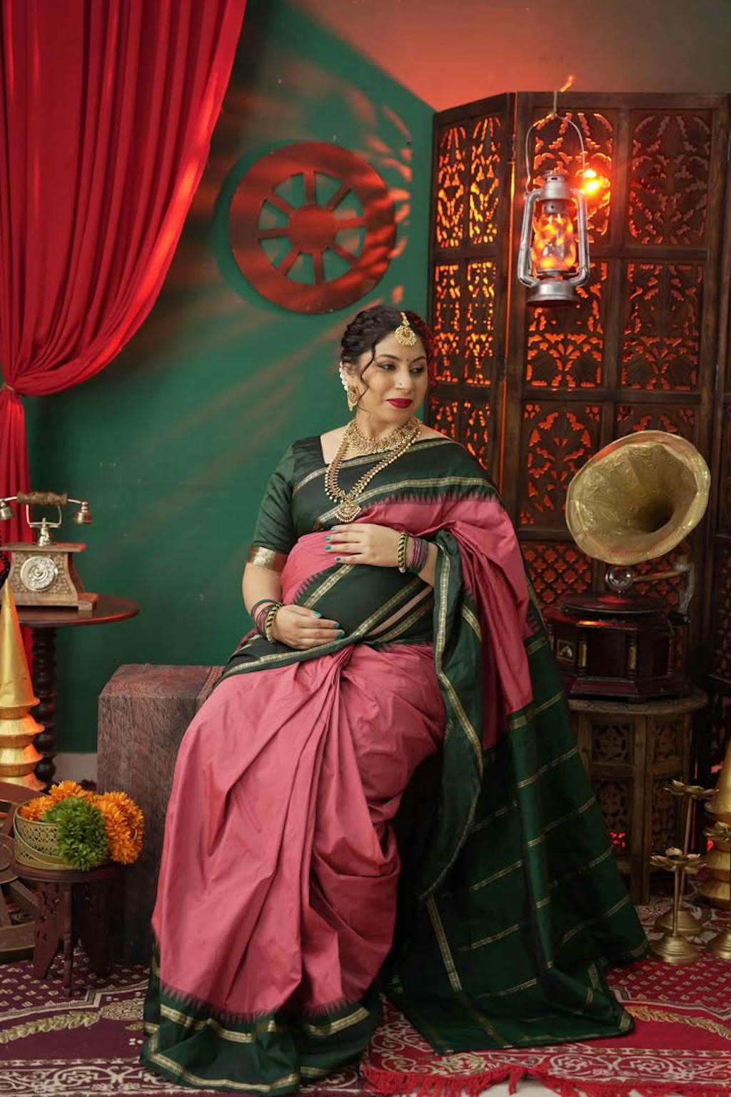 A stunning pastel pink semi Bangalore silk saree with a bottle green border and a double rudraksham gold zari border. The saree has a bottle green striped zari pallu.