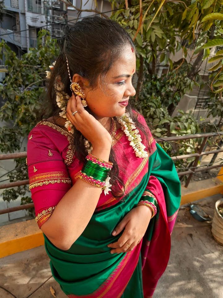 A stunning green semi Bangalore silk saree with a reddish pink and gold border with rudraksham buttas on the border. The saree has a pink pallu with zari lines on it.